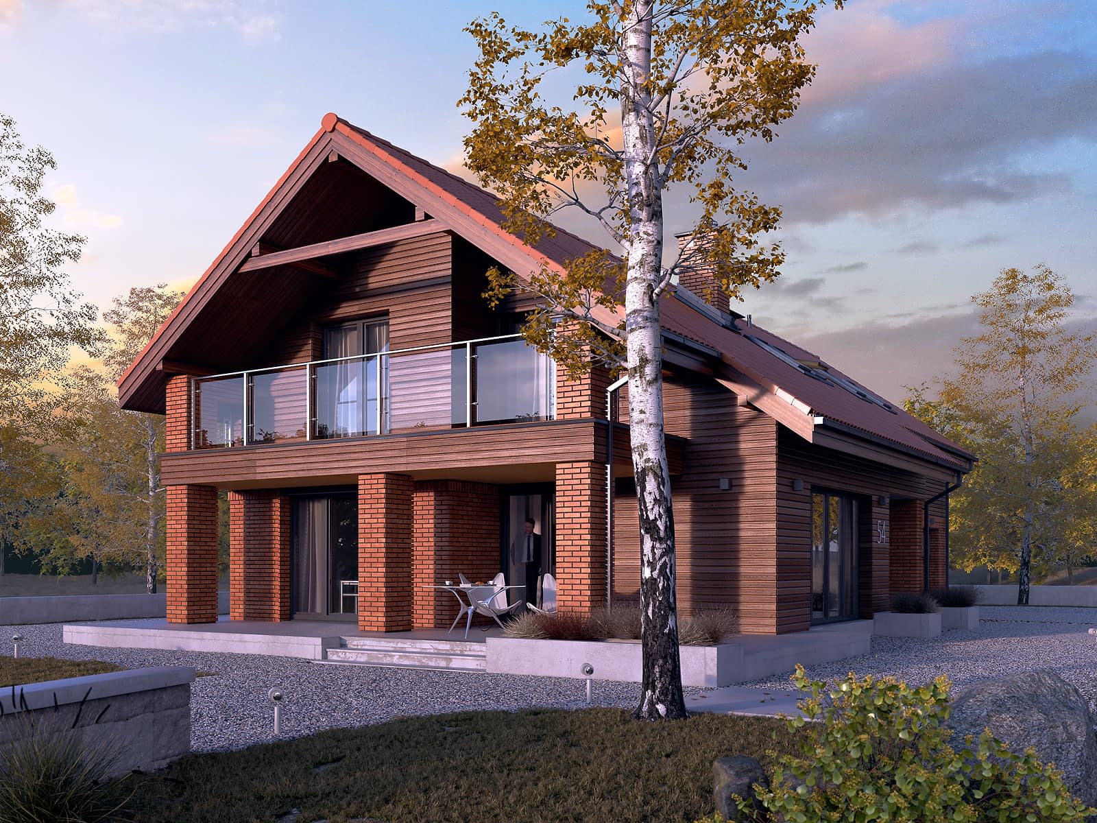 Karmin 2 to projekt domu przeznaczony na działkę z wjazdem od południa. Program użytkowy został podzielony na strefę dzienną na parterze oraz na nocną na poddaszu. Strefę dzienną tworzy przestronny salon, który płynnie łączy się z jadalnią oraz kuchnią z przylegającą do niej spiżarnią. Program funkcjonalny parteru uzupełnia gabinet, wc oraz pomieszczenie gospodarcze pod schodami. Na poddaszu zaprojektowano pięć pokoi, ogólnodostępną łazienkę oraz garderobę. Główna sypialnia gospodarzy posiada prywatną łazienkę i garderobę. W bryle budynku znajduje się również dwustanowiskowy garaż z przejściem do kotłowni. Elewacja budynku została wykończone okładziną ceramiczną i ciemną szalówka, które w połączeniu z tradycyjną czerwoną dachówką, nadają budynku rustykalnego charakteru. Karmin 2 jest propozycją przestronnego domu o rozbudowanym programie funkcjonalnym, przeznaczonym dla 6-7 osobowej rodziny.Konstrukcja
