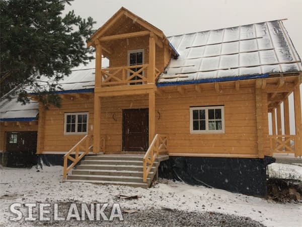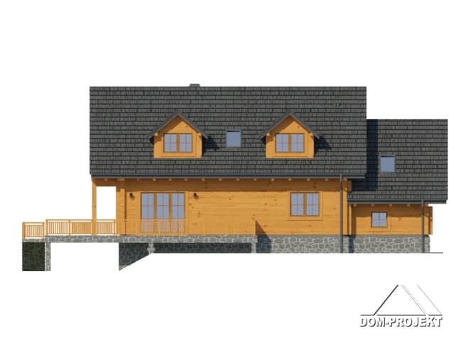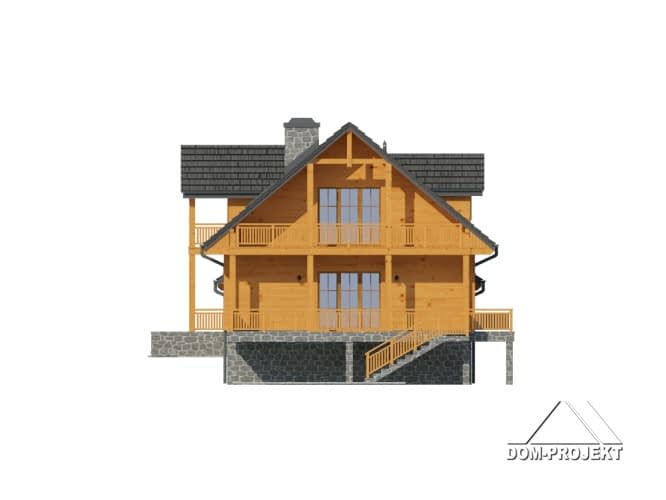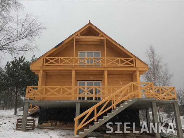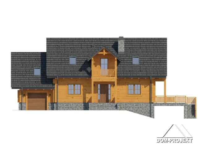 Dom z bali drewnianych. Duży salon z aneksem kuchennym, kominkiem i wyjściem na zadaszony taras. Pokój, łazienka, wiatrołap, komunikacja, garaż i pomieszczenie gospodarcze. Na poddaszu cztery pokoje, łazienka, garderoba i dwa zadaszone balkony. W piwnicach pomieszczenie rekreacyjne z kuchnią gospodarczą, wc, spiżarką. Pralnia, sauna, piwnica i komunikacja.Rzuty
