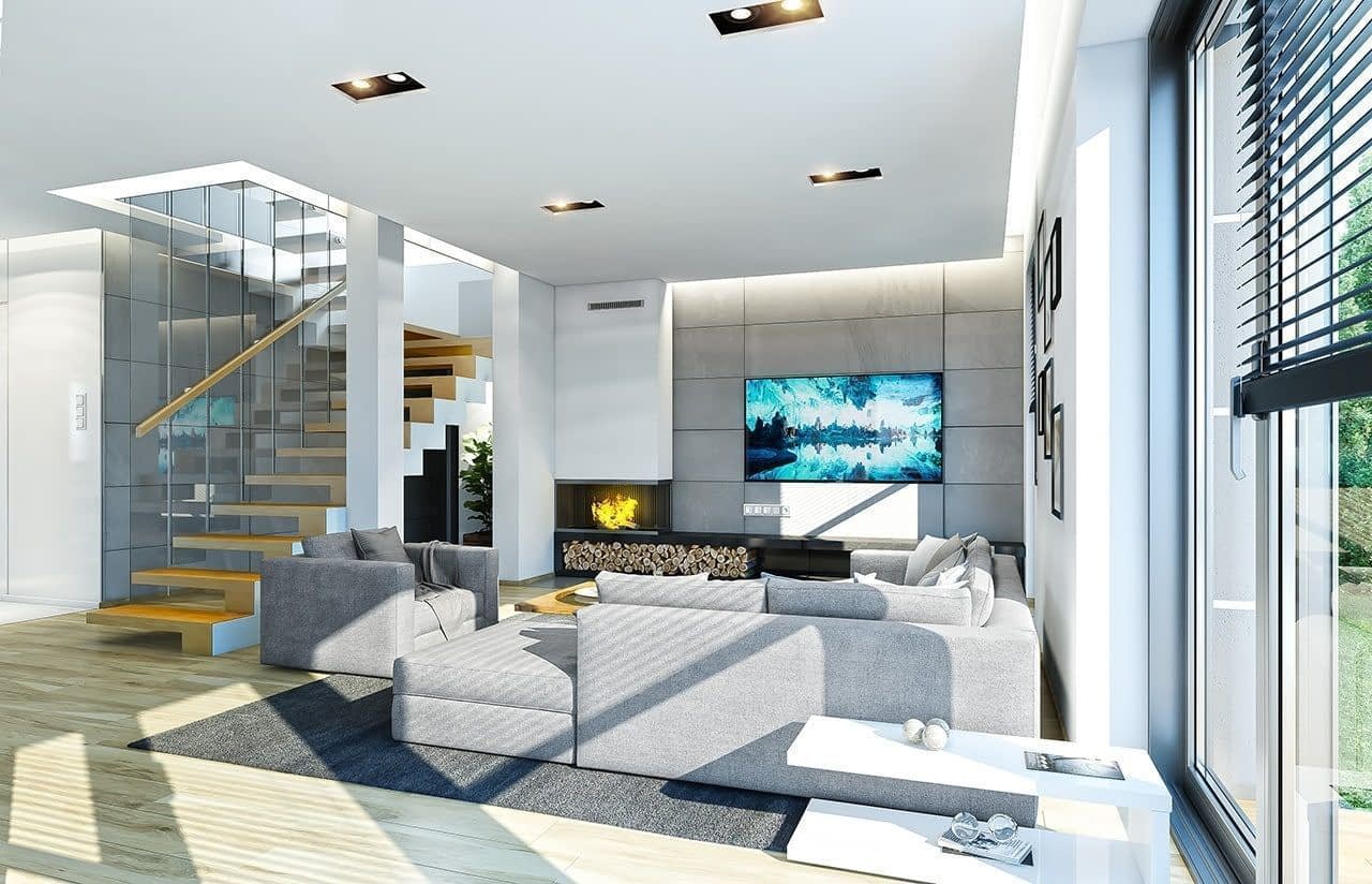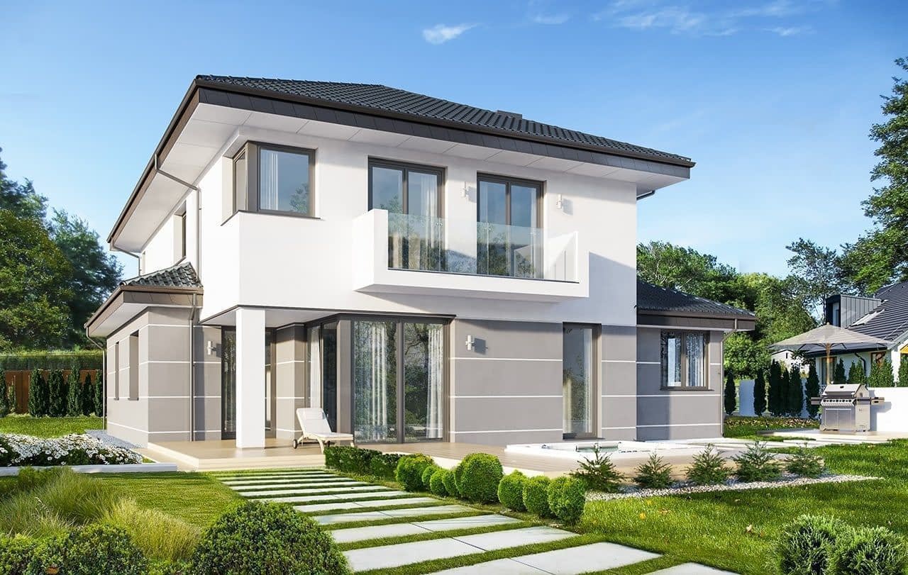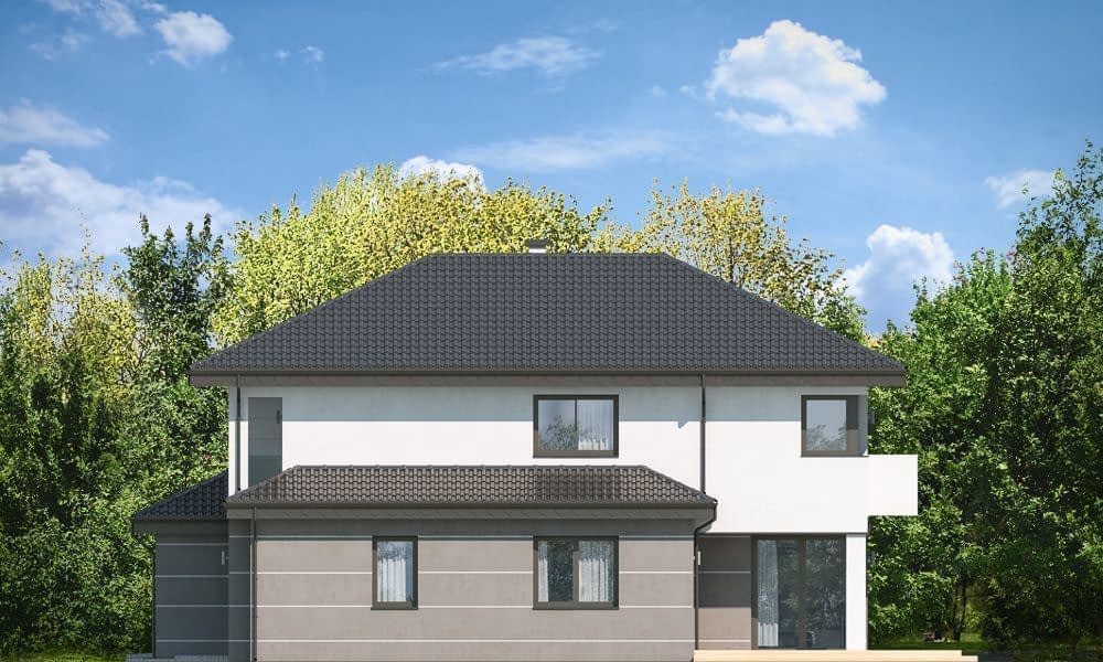 Projekt domu Kasjopea 7 to zupełnie nowy projekt z popularnej kolekcji domów „Kasjopea”. Projekt różni się zasadniczo od pozostałych domków z tej kolekcji, ma nowy oryginalny i nowoczesny wyraz architektoniczny. Osiągnięto go łącząc prostotę, oszczędność dodatków i detali, oraz ciekawą kolorystykę i materiały. Projekt domu Kasjopea 7 to budynek piętrowy, dla cztero-siedmioosobowej rodziny. Bryła domu jest piętrowa, przykryta czterospadowym dachem, z dobudowaną parterową częścią z garażem dwustanowiskowym. Projekt domu Kasjopea 7 to duża, komfortowa i reprezentacyjna willa, przeznaczona dla Inwestorów, którzy marzą o swobodzie przestrzeni. Jednocześnie budynek ma praktycznie zaprojektowane wnętrze, a jego konstrukcja jest dość prosta i łatwa w budowie. Elewacje domu podzielone są na poziome pasy. Dolny pas parteru ma szare boniowania, ściany piętra pozostają białe. Duże okna, podcienie i balkony dodatkowo ozdabiają bryłę budynku. Całość tworzy nowoczesną i dynamiczną sylwetkę domu. Wnętrze : parter to przede wszystkim naprawdę duży salon, połączony z jadalnią i holem, tworzący niemal 60ciometrową przestrzeń dzienną. Przy wejściu do domu od frontu zaprojektowano dużą kuchnię ze stołem na szybkie posiłki. Z przedsionka dostajemy się do podwójnego garażu i do kotłowni. Za schodami, nieco odseparowany od salonu zlokalizowany jest dodatkowy pokój z własną łazienką : gabinet, lub sypialnia gościnna. Może to być również pokój dla seniora. Na piętrze zaprojektowano aż cztery sypialnie i dwie łazienki. Sypialnie dzieci mają wbudowane szafy. Sypialnia rodziców to osobny apartament z własną łazienką, garderoba i zadaszonym balkonem. Projekt domu Kasjopea 7 to komfortowy, funkcjonalnie zaprojektowany dom, o nowoczesnej i reprezentacyjnej architekturze. Projekt bardzo łatwo można dostosować do standardu NF40. Projekt dostępny jest w odbiciu lustrzanym i z wyższym kątem nachylenia dachu (projekt domu Kasjopea 7 B) oraz kilku wersjach: podstawowa (projekt domu Kasjopea) i jej wersja odświeżona (projekt domu Kasjopea 8), bliźniak (projekt domu Kasjopea 2), ze zmienionym układem pomieszczeń (projekt domu Kasjopea 3), pomniejszona (projekt domu Kasjopea 4), komfortowa (projekt domu Kasjopea 5), największa (projekt domu Kasjopea 6).