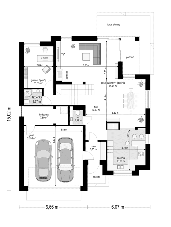 - Długość domu15.02 m