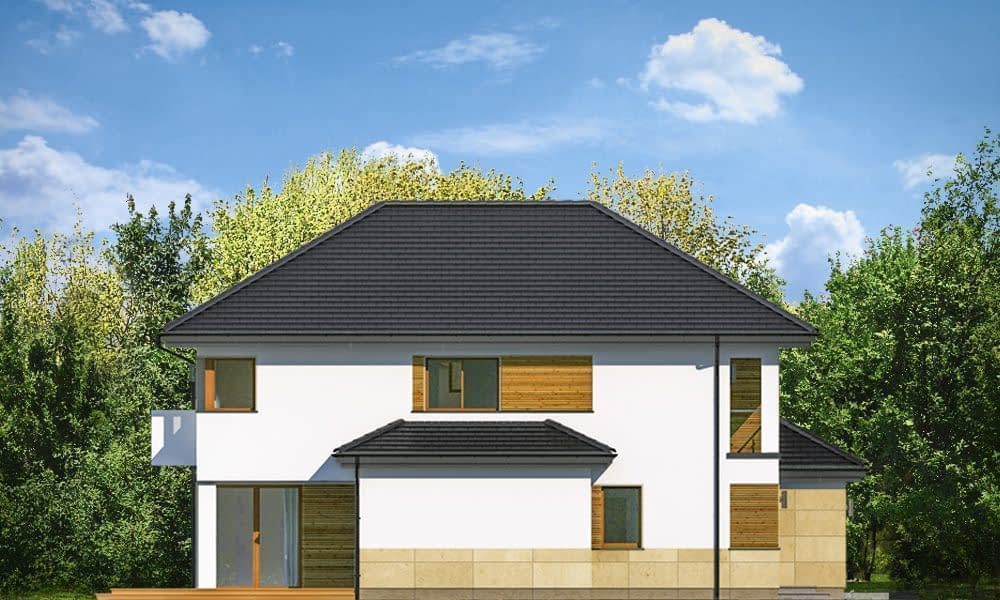 Projekt domu Kasjopea 8 jest kolejną wersją z popularnej serii domów „Kasjopea”. Jest on odświeżoną wersją bazowego projektu z tej kolekcji, do którego wprowadzono szereg modyfikacji - przede wszystkim dach o wyższym kącie nachylenia. Kasjopea 8 to projekt budynku piętrowego, dla 4-5 osobowej rodziny. Prostokątna bryła przykryta jest czterospadowym dachem. W główną bryłę wbudowany jest jednostanowiskowy garaż. Nowoczesna architektura łączy się tutaj z funkcjonalnie zaprojektowanym wnętrzem. Elewacje domu ozdobione są okładzinami z kamienia ( lub boniowaniami tynku ), oraz z drewna. Podział ścian na poziome pasy, dodatkowa frontowa loggia, oraz balkon od strony ogrodowej urozmaicają bryłę. Wnętrze domu podzielono na część dzienną i gospodarczo-garażową na parterze, oraz sypialnie na piętrze. Parter to jednoprzestrzenne wnętrze salonu, jadalni i holu. Z pokoju dziennego mamy piękne przeszklenie, otwierające wnętrze na ogród i częściowo zadaszony podcieniem taras. Półotwarta kuchnia ze spiżarnią umieszczona jest niedaleko wejścia i garażu. Z garażu dostępnego z przedsionka dostajemy się do kotłowni domu. Piętro to aż cztery sypialnie i dwie łazienki. Sypialnie dzieci mają wbudowane szafy, natomiast sypialnia rodziców to osoby apartament z własną łazienką, garderobą i zadaszonym balkonem. Dom ma dość prostą konstrukcję, jest bardzo dobrze ocieplony. Będzie łatwy w budowie i niedrogi w późniejszej eksploatacji. Kasjopeę 8 można łatwo dostosować do standardu NF40. Zapraszamy.