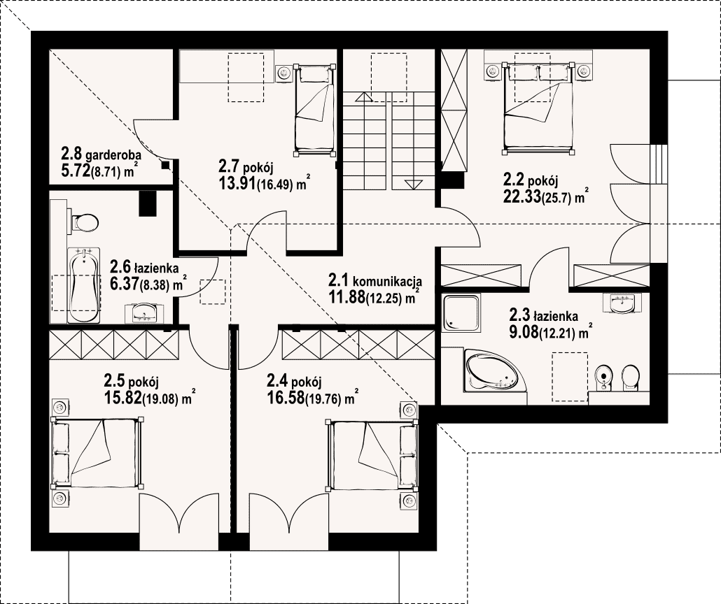 Dom z poddaszem. Duży salon z aneksem kuchennym, kominkiem i wyjściami na taras. Pokój, łazienka, komunikacja ze schodami na poddasze, wiatrołap, kotłownia i garaż na dwa samochody. Na poddaszu cztery pokoje, dwie łazienki, garderoba, komunikacja i dwa balkony.Rzuty