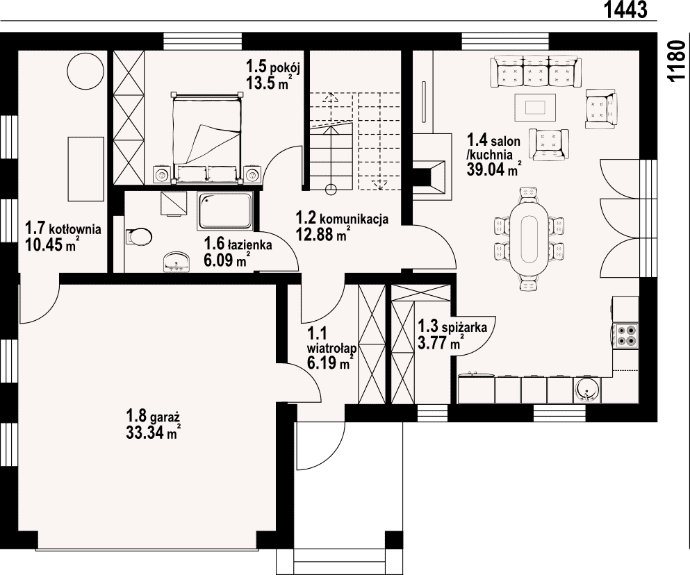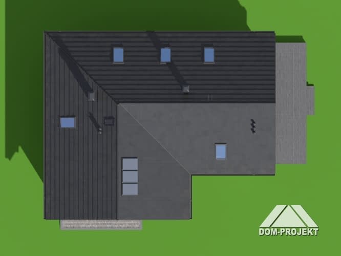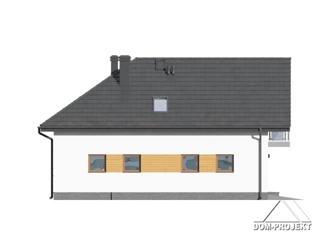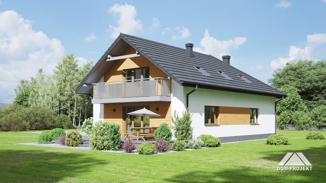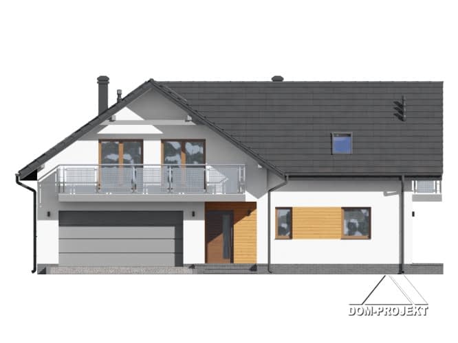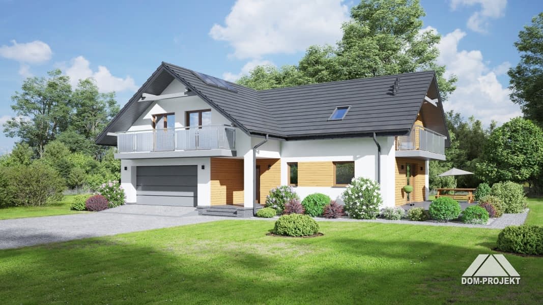 Dom z poddaszem. Na parterze duży salon z aneksem kuchennym, kominkiem i wyjściem na taras. Spiżarka, wiatrołap z miejscem na szafy, komunikacja, pokój, łazienka. kotłownia oraz garaż na dwa samochody. Na poddaszu cztery pokoje, dwie łazienki, dwie garderoby, komunikacja oraz dwa balkony. Jeden z pokoi poddasza ma własną łazienkę, garderobę i wyjście na balkon.Rzuty