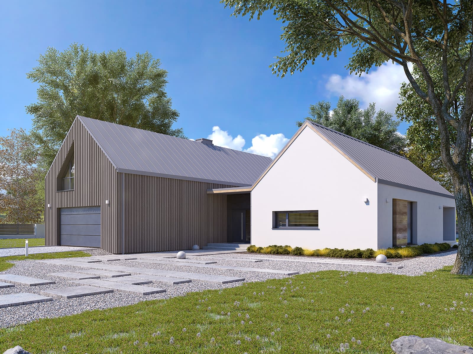 Katamaran dr-S jest projektem domu w stylu nowoczesnej stodoły. Bryła tego budynku składa się z dwóch brył połączonych korytarzem. Podział ten jasno definiuje strefy. Dach został wykończony blachą, a ściany tynkiem oraz szalówką. Wewnątrz znajdują się trzy przestronne sypialnie, garaż dwu stanowiskowy oraz otwarta kuchnia połączona z jadalnią i pokojem dziennym z widokiem na zadaszony tarasKonstrukcja
