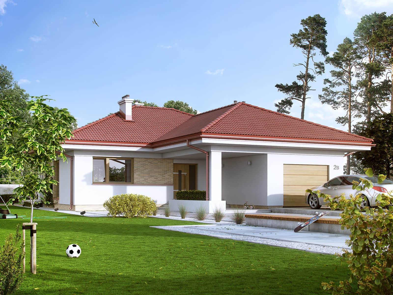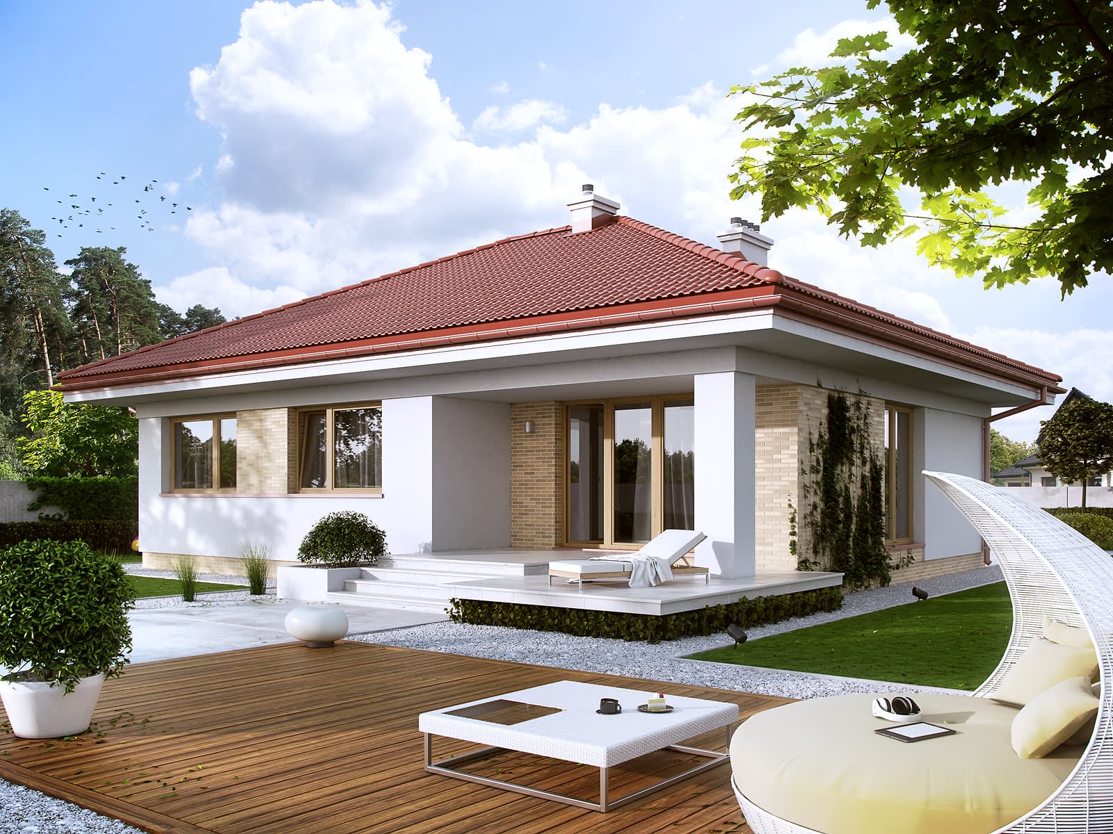 Jednorodzinny budynek mieszkalny, parterowy, niepodpiwniczony. Optymalny układ pomieszczeń zapewnia komfort 4-osobowej rodzinie. W części dziennej domu zaprojektowano kuchnię z jadalnią oraz salon otwierający się na zewnątrz poprzez szereg przeszkleń. Część nocna to trzy sypialnie oraz łazienka. W części gospodarczej przewidziano kotłownię oraz jednostanowiskowy garaż.Konstrukcja