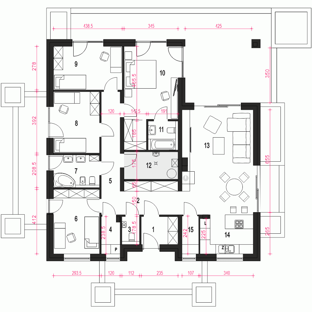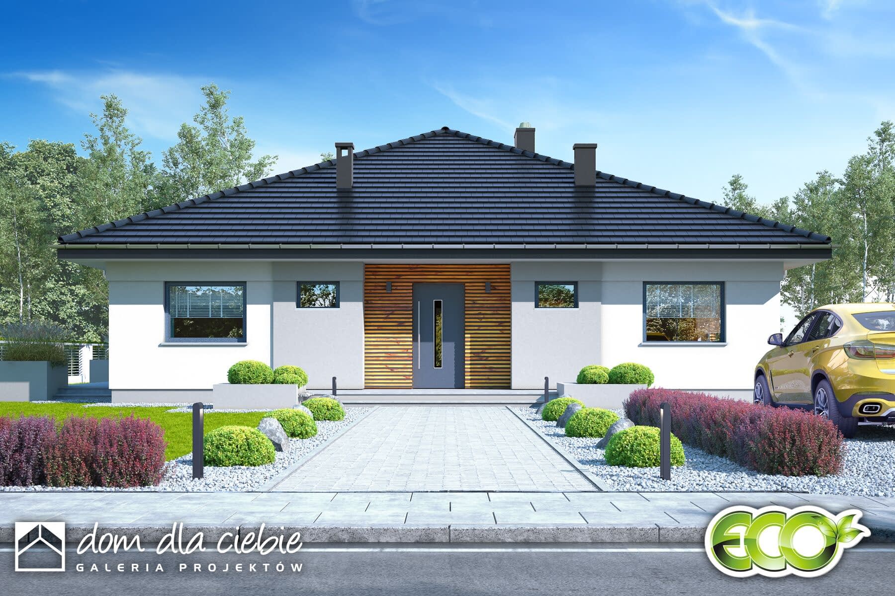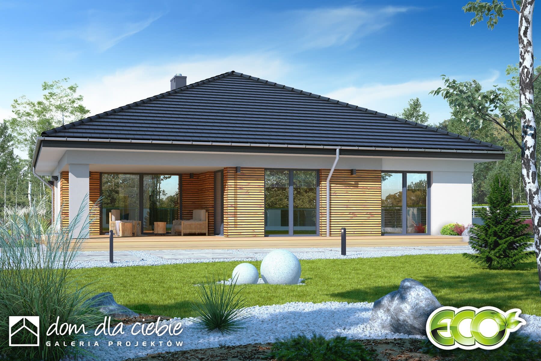 Projekt domu parterowego Klara II bez garażu to idealna propozycja dla 4 do 5cio osobowej rodziny. Dom zaprojektowany jest w technologii murowanej z tradycyjną więźbą dachową, przekryty spadzistym dachem kopertowym. To funkcjonalny projekt domu parterowego, łączący strefę ogólnodostępną i prywatną na jednej kondygnacji. Projekt jest większą wersją projektu Klara i został powiększony o jedną dodatkową sypialnię, w wyniku czego posiada 5 pokoi w tym salon. W części wejściowej mamy zaprojektowany wygodny wiatrołap i hol z szafami wnękowymi, pralnię oraz toaletę. W części ogólnodostępnej przewidziano przestronny i dobrze doświetlony salon z miejscem na wygodny stół jadalniany, z widokiem na ogród. Dzięki dużym drzwiom tarasowym od strony ogrodowej, dostaniemy się wprost na taras zewnętrzny, zadaszony podcieniem. W strefie ogólnodostępnej projekt przewiduje również wygodną kuchnię z wyspą i praktyczną spiżarnią. Kuchnia z układem mebli w kształcie litery "L", zapewnia wygodną przestrzeń do pracy, a duże frontowe okno doświetla idealnie przestrzeń roboczą. Do części prywatnej domu dostaniemy się przez korytarz dostępny z holu wejściowego. W części prywatnej mamy zaprojektowane cztery pokoje sypialne w tym jeden typu master bedroom. Znajdziemy tu też wygodną, wspólną łazienkę z wanną oraz pomieszczenie techniczne z piecem CO. Klara II to atrakcyjna propozycja domu energooszczędnego, o nowoczesnym wyglądzie. To projekt domu z serii "eco" - ekonomiczny w budowie i w utrzymaniu - idealna propozycja dla rodzin planujących budowę pierwszego domu.