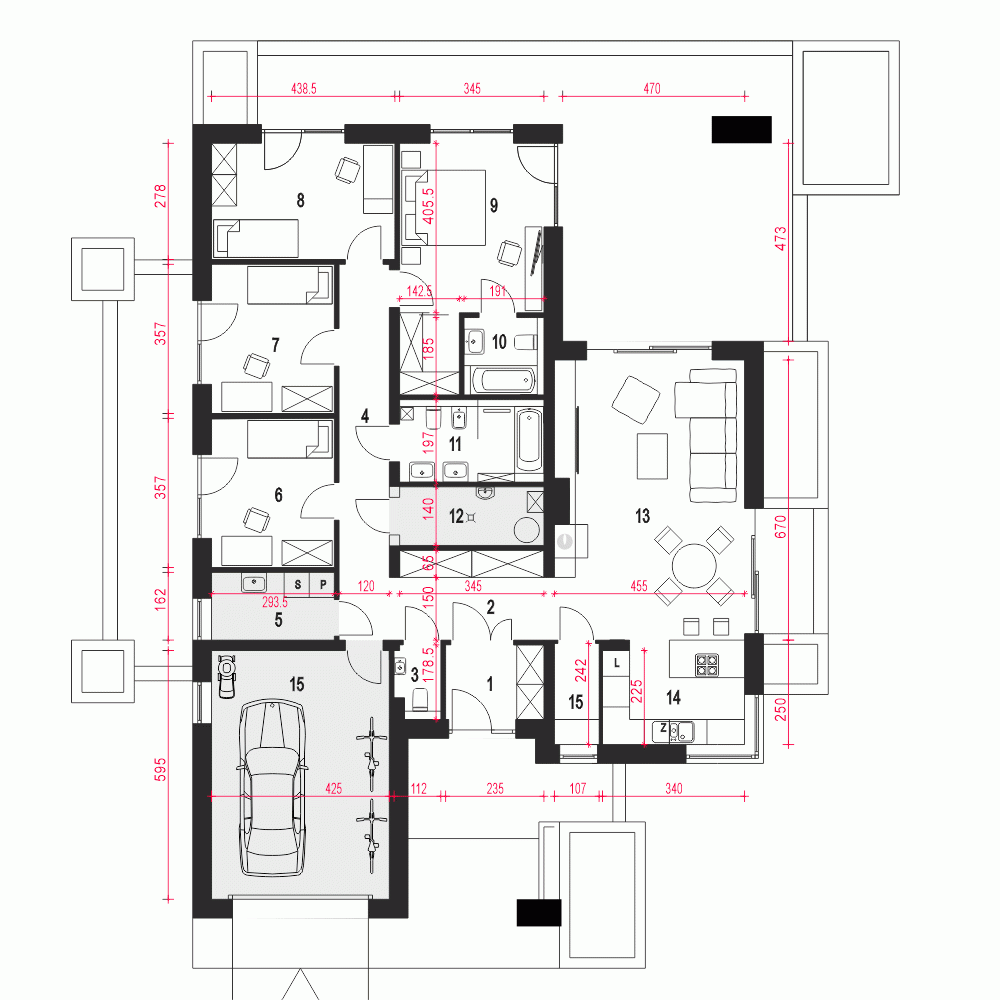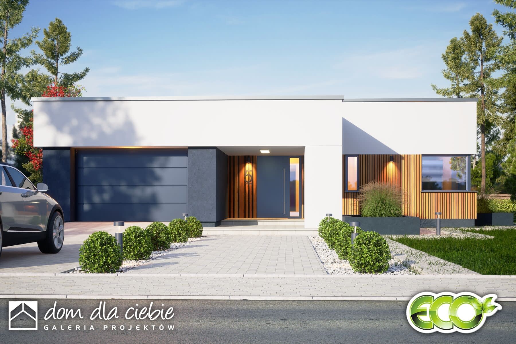 Projekt domu parterowego Klara VIII z garażem to idealna propozycja dla 5-osobowej rodziny. Dom zaprojektowany jest w technologii murowanej jako przekryty płaskim dachem. Klara VIII to funkcjonalny projekt domu parterowego, łączący strefę ogólnodostępną i prywatną na jednej kondygnacji. Projekt jest opracowany w oparciu o projekt Klara V, względem którego różni sie sposobem przekrycia budynku. W części wejściowej mamy zaprojektowany wygodny wiatrołap i hol z szafami wnękowymi, pralnię oraz toaletę. W części ogólnodostępnej przewidziano przestronny i dobrze doświetlony salon z miejscem na wygodny stół jadalniany, z widokiem na ogród. Dzięki dużym drzwiom tarasowym od strony ogrodowej, dostaniemy się wprost na taras zewnętrzny. W strefie ogólnodostępnej projekt przewiduje również wygodną kuchnię z wyspą i praktyczną spiżarnią. Kuchnia z układem mebli w kształcie litery "L", zapewnia wygodną przestrzeń do pracy, a duże frontowe okno doświetla idealnie przestrzeń roboczą. Do części prywatnej domu dostaniemy się przez korytarz dostępny z holu wejściowego. W części prywatnej mamy zaprojektowane cztery pokoje sypialne, w tym jeden typu master bedroom. Znajdziemy tu też wygodną, wspólną łazienkę z wanną oraz pomieszczenie techniczne z piecem CO. Klara VIII to atrakcyjna propozycja domu energooszczędnego, o nowoczesnym wyglądzie. To projekt domu z serii "eco" - ekonomiczny w budowie i w utrzymaniu - idealna propozycja dla rodzin planujących budowę pierwszego domu.