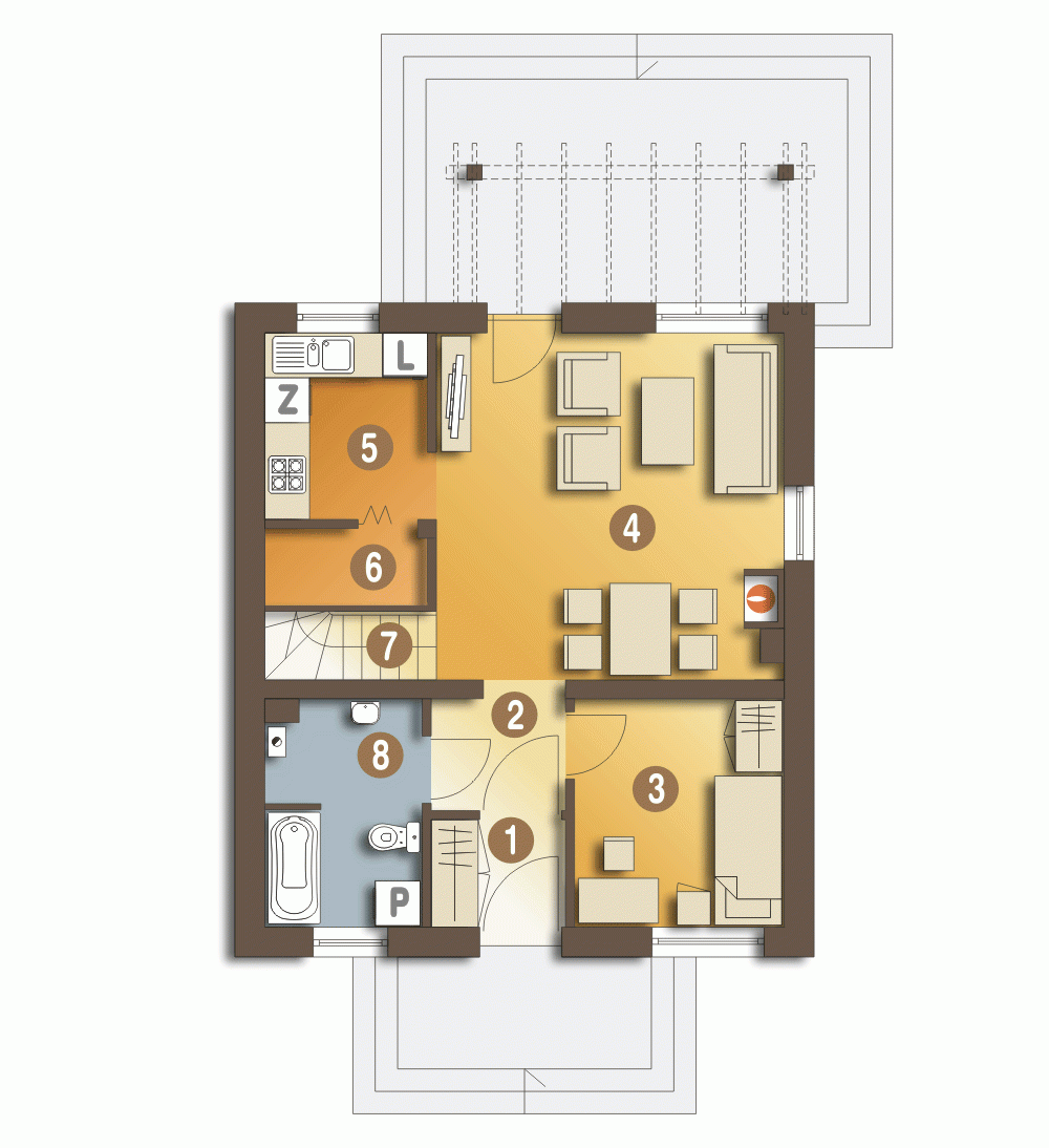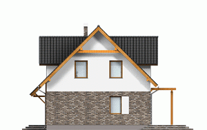 Niewielki dom jednorodzinny przeznaczony dla 4-osobowej rodziny, nadający się na wąską działkę. Nad wejściem zaprojektowano funkcjonalny daszek chroniący przed opadami, a na tarasie pergolę zacieniającą. Na parterze przewidziano salon, kuchnię ze spiżarnią i pomieszczenie gospodarcze oraz dodatkowy pokój/gabinet. Na poddaszu znajdziemy trzy sypialnie oraz wygodną łazienkę. ...Sprawdź inne projekty domów. Zapraszamy!