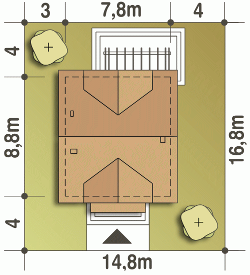 - Minimalne wymiary działki16.8 x 14.8m