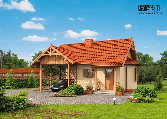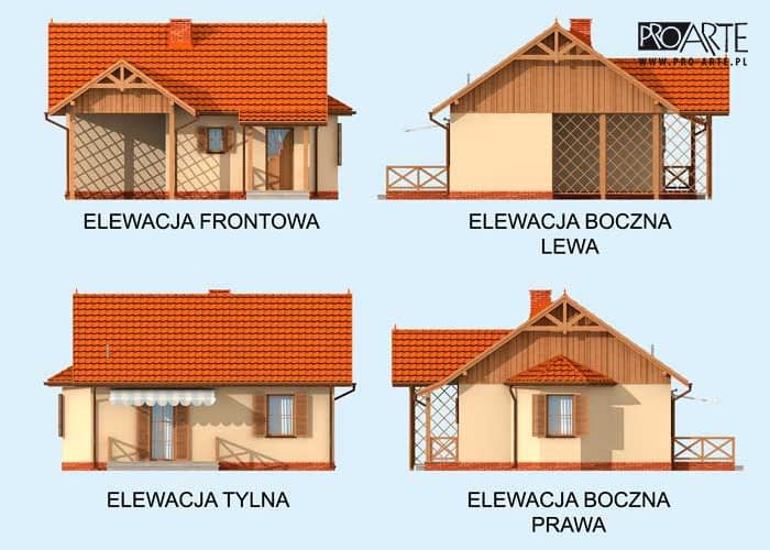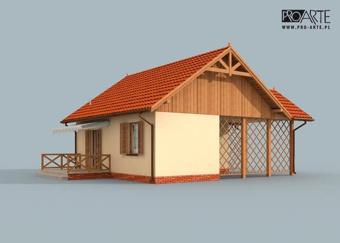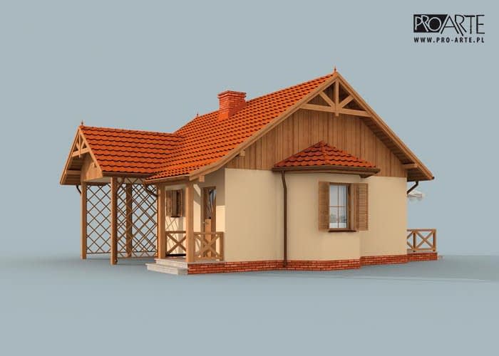 Gdyby spróbować wskazać pierwsze myśli, jakie łączą się z nazwą Kolorado, to z pewnością w wielu przypadkach byłyby to samowystarczalność i schronienie. Podobnie jest z naszym projektem o tej samej nazwie: bezpieczeństwo i kompleksowe rozwiązania Kolorado tworzą pełną czaru oraz stylu budowlę. Odeskowanie, zwieńczenia dachu, jętki, drewniane okiennice oraz zwracający uwagę wykusz decydują o eleganckim a zarazem sielskim charakterze domu. Od południa znajduje się ganek oraz wiata i to one dzięki ciekawym drewnianym zdobieniom przykuwają uwagę. Gdy dobrze się przyjrzymy, to można zauważyć, że od wschodu w bryle budynku znajduje się wypust, to wykusz, który skrywa jadalnię. Po przejściu przez ganek, w wiatrołapie znajdziemy miejsce na garderobę pod zabudowę. Dalej, po przejściu do komunikacji, jej lewa część wiedzie do kuchni, zaś po prawej jest wspomniana jadalnia. Za nią znajduje się największe pomieszczenie, czyli pokój dzienny z aneksem kuchennym, kominkiem. Całości wnętrz dopełnia sypialnia. Z pokoju dziennego można wyjść na taras, który będzie miejscem niejednej biesiady w gronie bliskich, letniego śniadania, czy romantycznej kolacji.