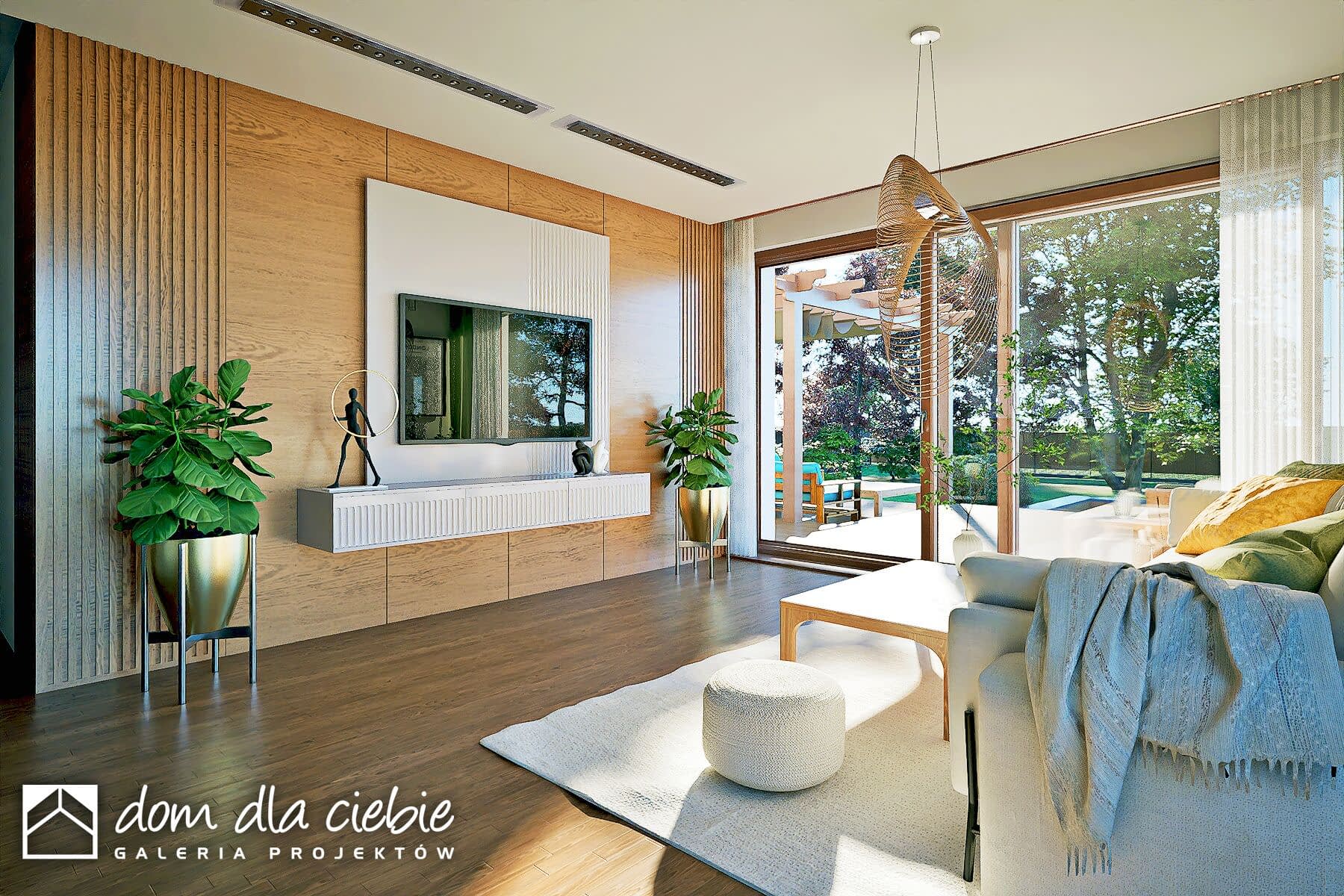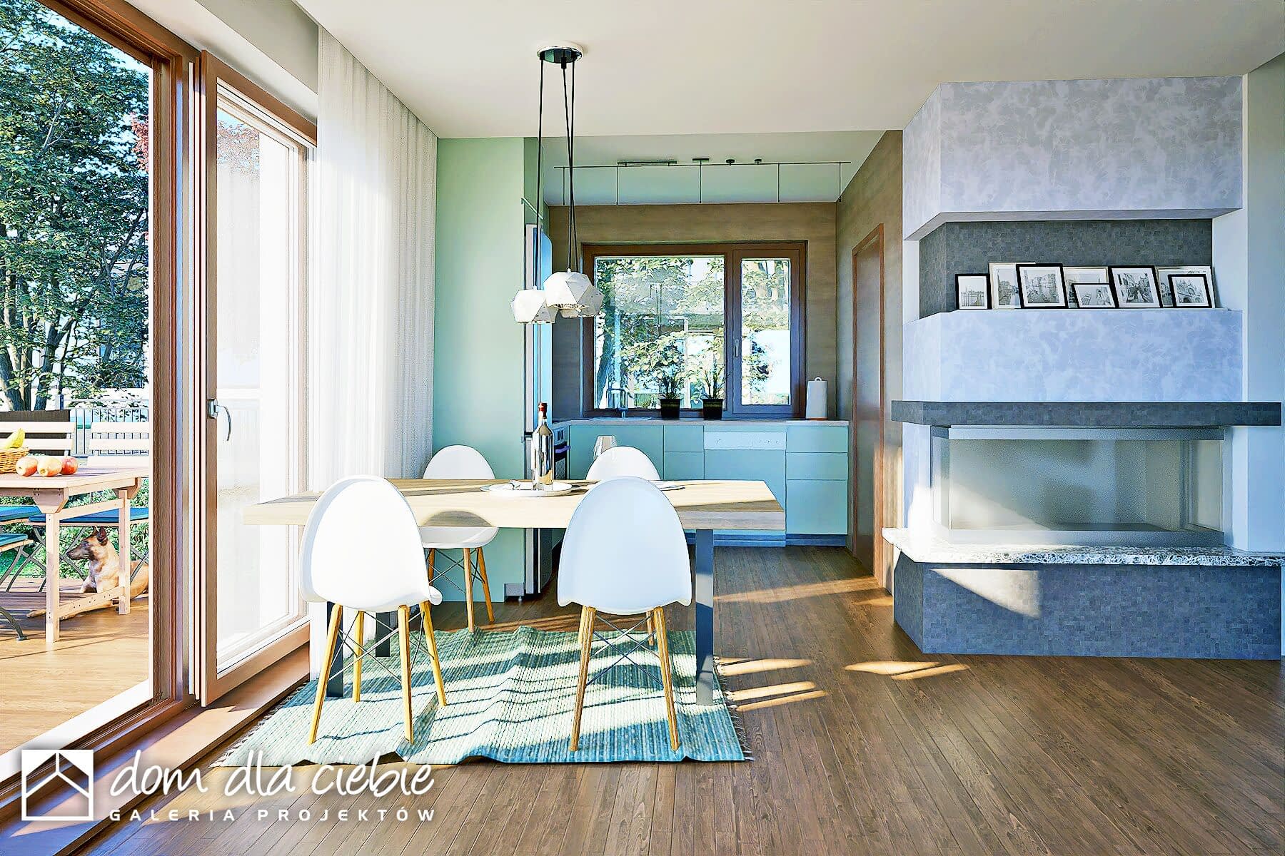 Kołysanka to kompaktowy dom jednorodzinny z poddaszem użytkowym, idealny dla 4–5-osobowej rodziny. Prosta bryła, dwuspadowy dach i elewacja z jasnego tynku oraz beżowego klinkieru nadają mu nowoczesny, a zarazem przytulny charakter. Zadaszone wejście w formie podcienia chroni przed niekorzystną pogodą.Na parterze znajduje się otwarta strefa dzienna z salonem, jadalnią i kuchnią ze spiżarnią. Kominek w centrum salonu tworzy ciepły klimat. Dodatkowy pokój z łazienką może służyć jako gabinet lub sypialnia. Zaplanowano też WC, schowek pod schodami i dostęp do garażu z przejściem do kotłowni z wyjściem na ogród.Poddasze mieści trzy sypialnie oraz przestronną łazienkę z wanną i prysznicem. Duże przeszklenia zapewniają doskonałe doświetlenie i otwierają dom na ogród. Projekt łączy elegancję z funkcjonalnością i sprawdzi się zarówno na działce podmiejskiej, jak i w spokojnym, naturalnym otoczeniu.
