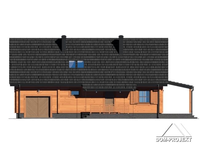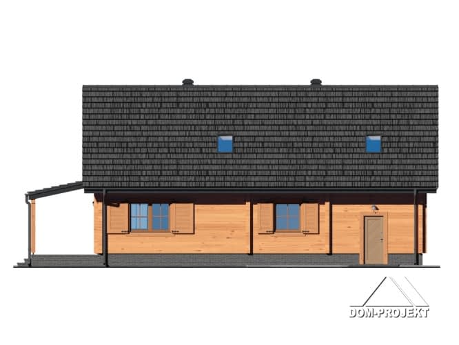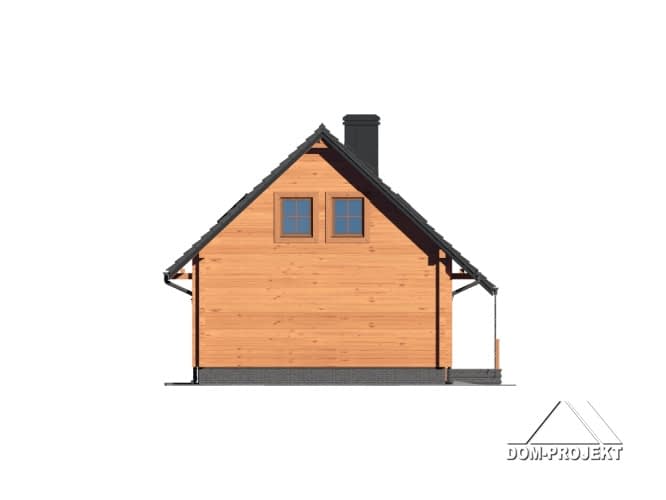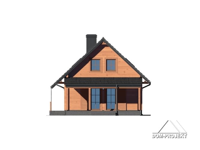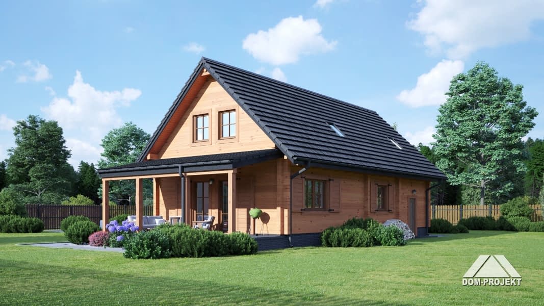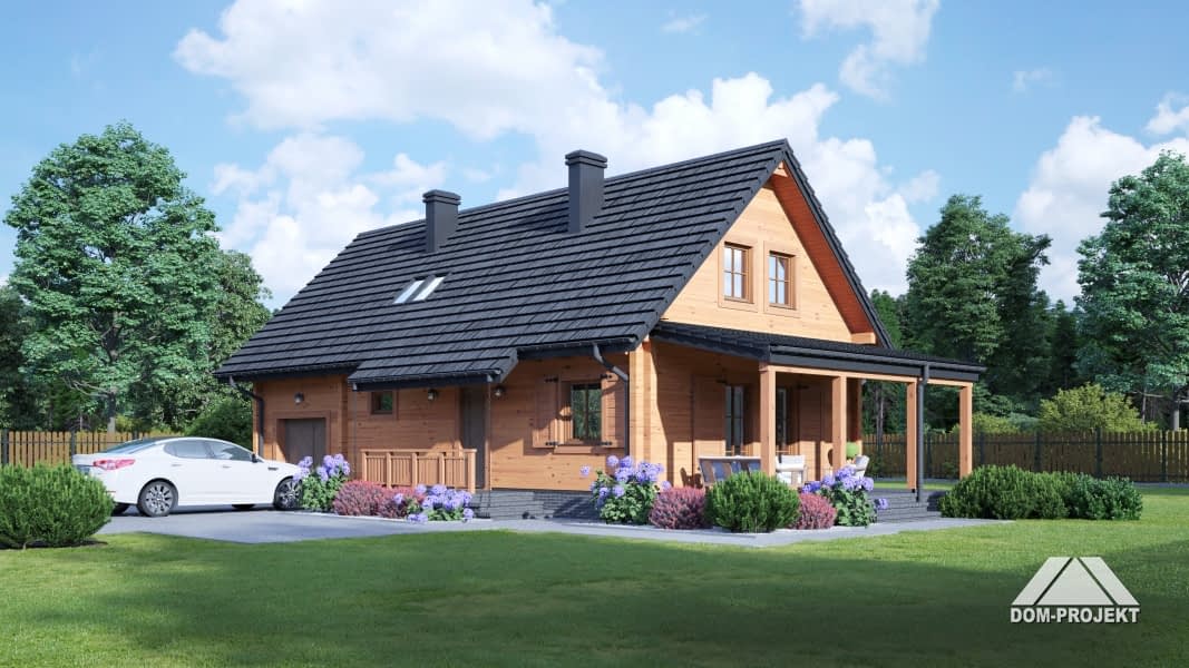 Dom z bali. Duży salon z aneksem kuchennym, kominkiem, wyjściem na zadaszony taras i schodami na poddasze. Pokój, łazienka, wiatrołap, kotłownia i garaż. Na poddaszu trzy pokoje, dwie garderoby łazienka i komunikacja. Zwarta bryła budynku i dach dwuspadowy sprzyjają szybkiej i taniej budowie i niskim kosztom eksploatacji.Rzuty