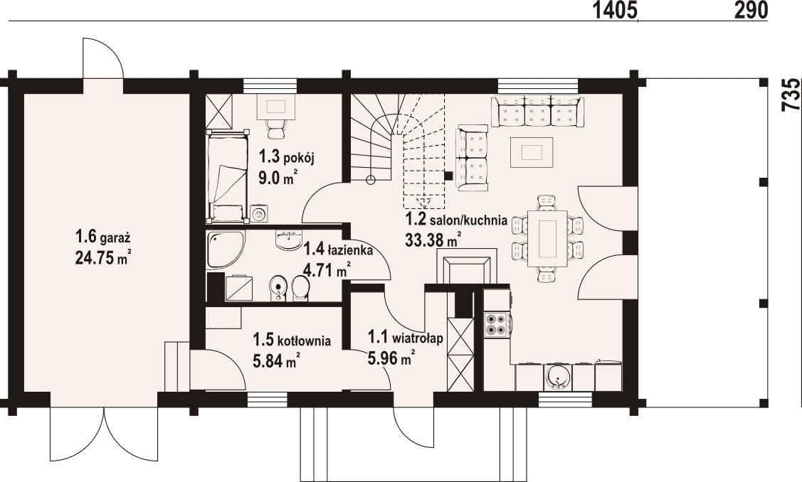 - 1.2 - kuchnia, salon33.38 m²