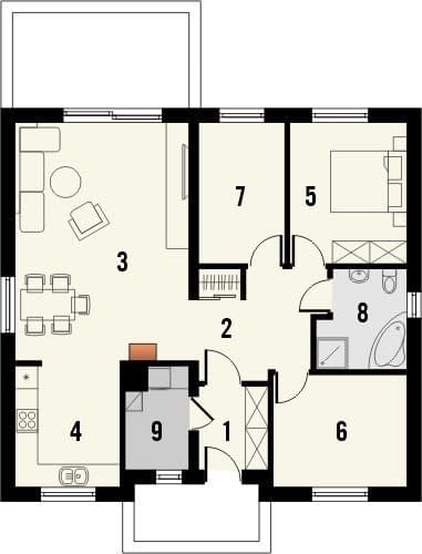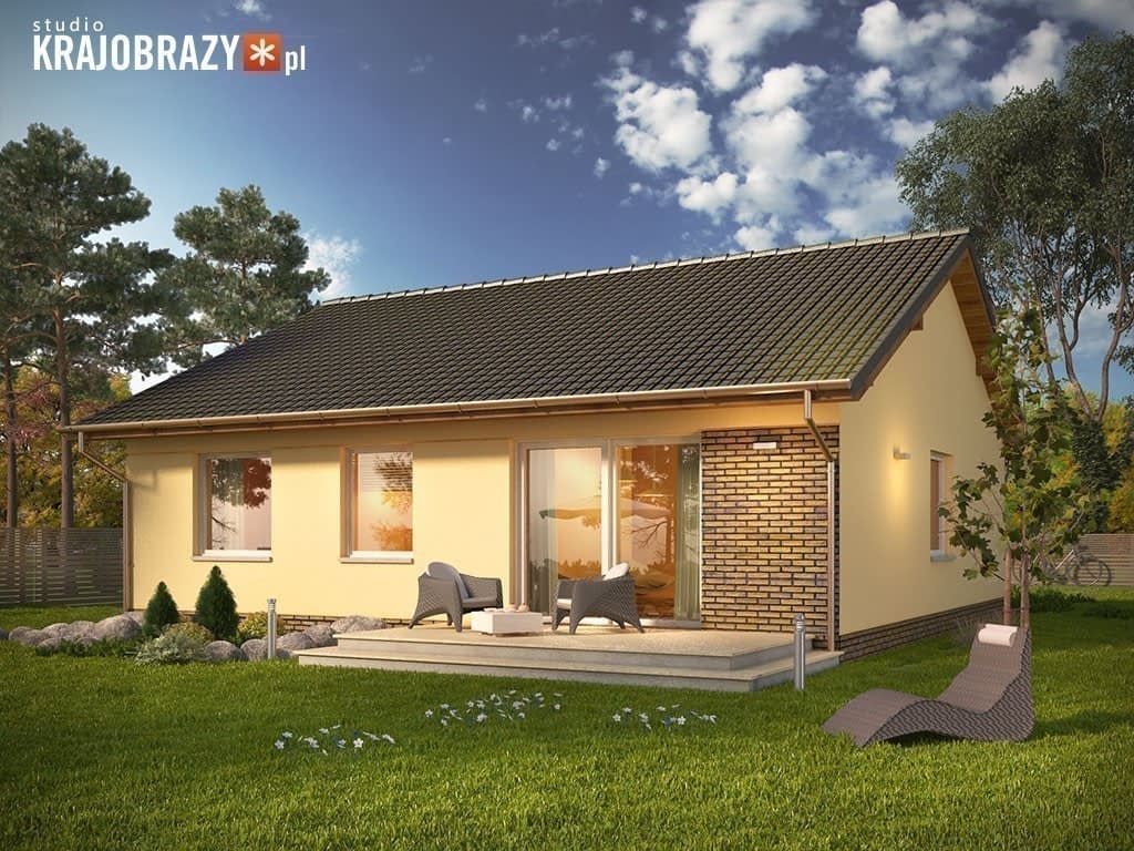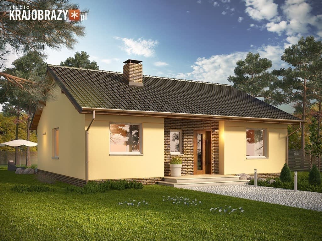 Kremówka to projekt niedużego (o powierzchni do 100m2) domu jednorodzinnego parterowego, przekrytego dwuspadowym dachem, bez garażu. Centralnie umieszczona, strefa wejściowa została wyróżniona okładziną elewacyjną i dodatkowo znalazła się we wnęce. Na tyłach domu znalazł się taras z dużymi oknami wychodzącymi z salonu. Dokumentacja dostępna jest w wariantach standard oraz odbicie lustrzane. Wszystkie pomieszczenia użytkowe znalazły się na jednej kondygnacji, jednak dzięki czytelnemu podziałowi na strefę dzienną i nocną udało się zachować podział funkcjonalny wnętrz. W obrębie części dziennej zaprojektowano salon z kominkiem, jadalnię oraz kuchnię, a także kotłownię dostępną z wiatrołapu. Strefę nocną tworzą 3 pokoje oraz łazienka, przewidziano również zabudowaną wnękę na garderobę, dostępną z holu.Rzuty