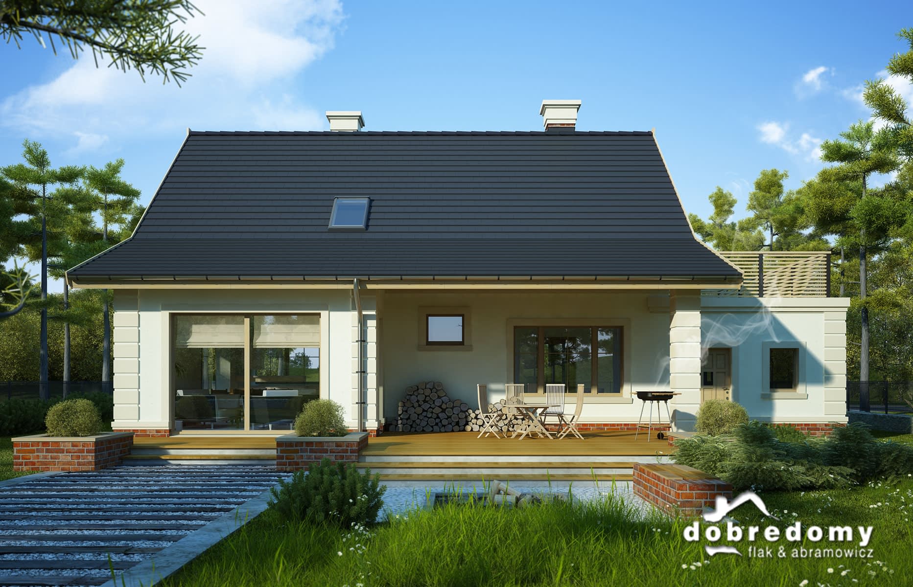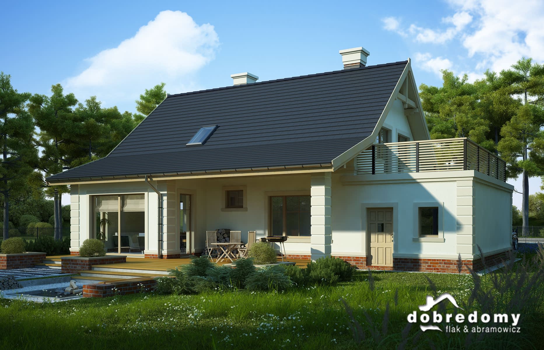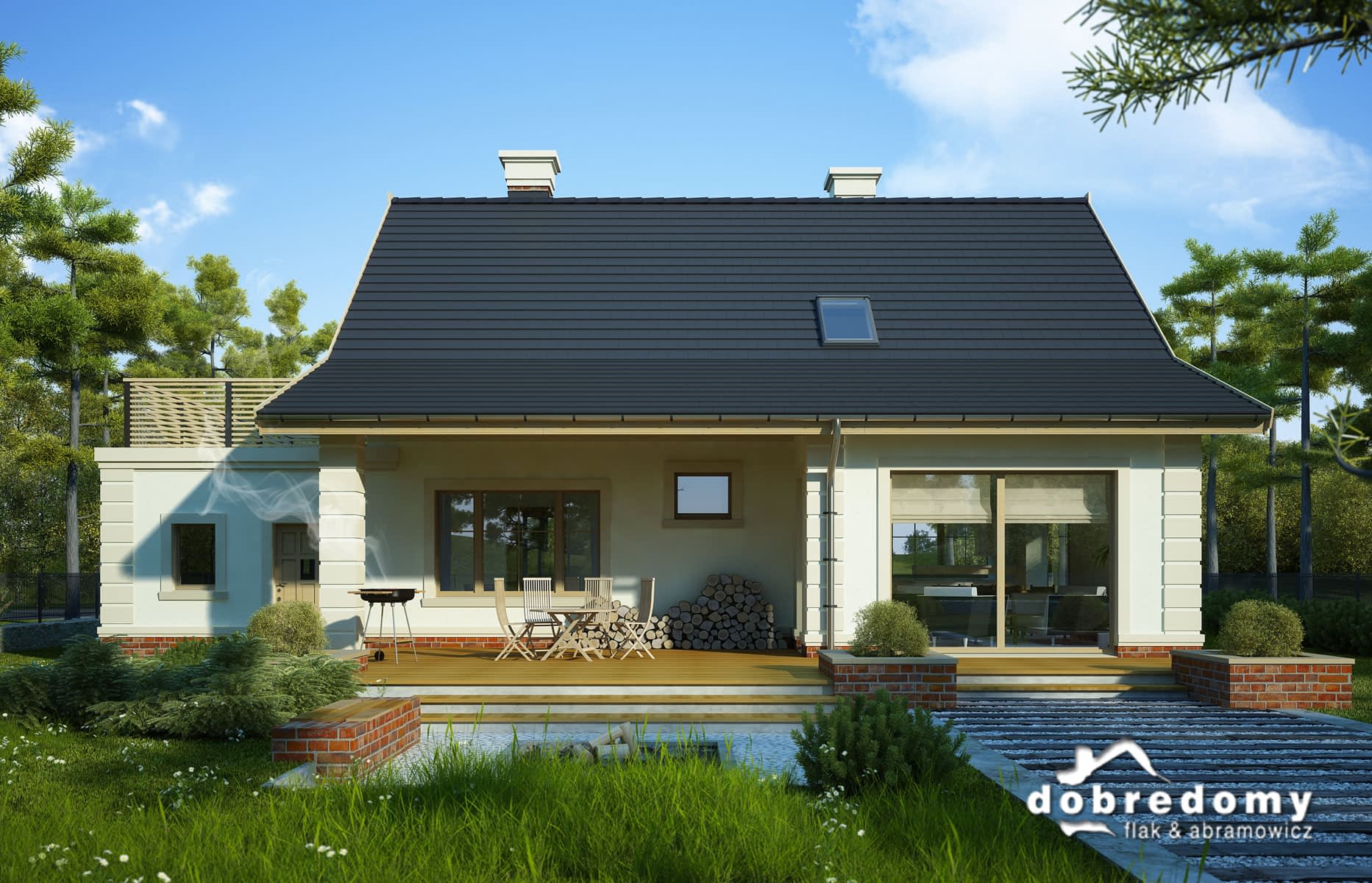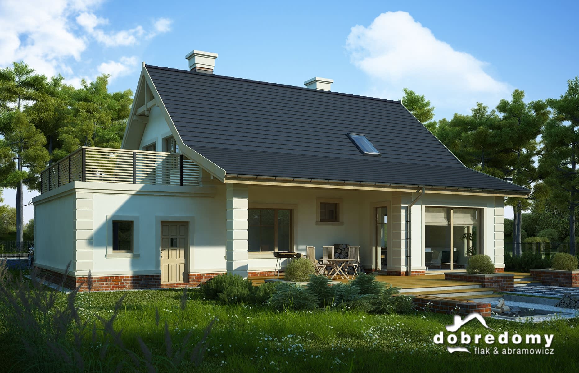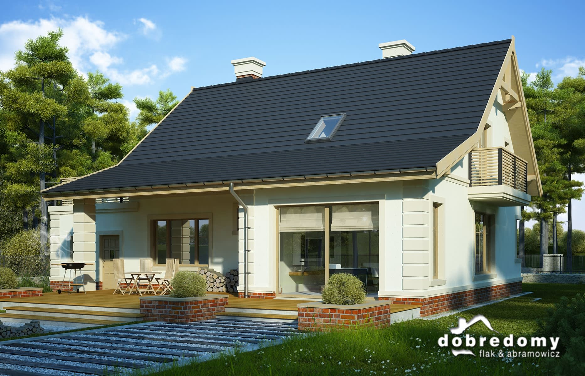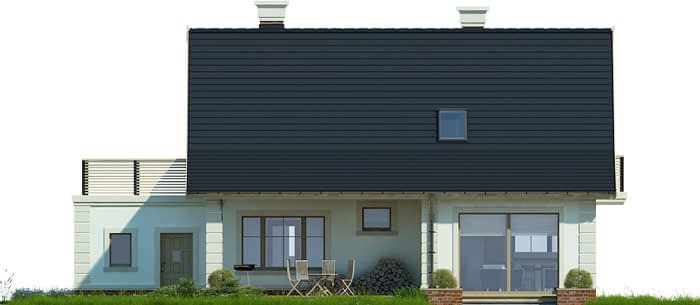 Elewacje pokryte okładziną klinkierową oraz tynkiem strukturalnym w systemie ociepleń Termo Organika. W projekcie zastosowano okna dachowe marki FAKRO. Pokrycie dachu - dachówka ceramiczna lub cementowa CREATON.