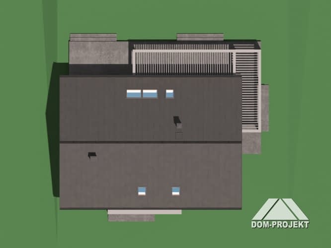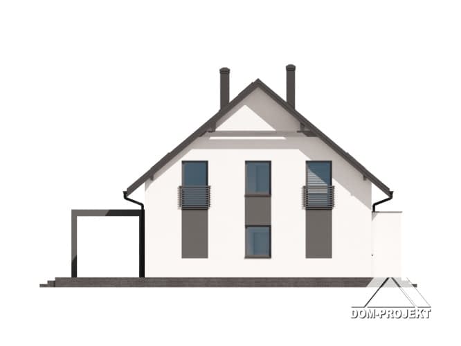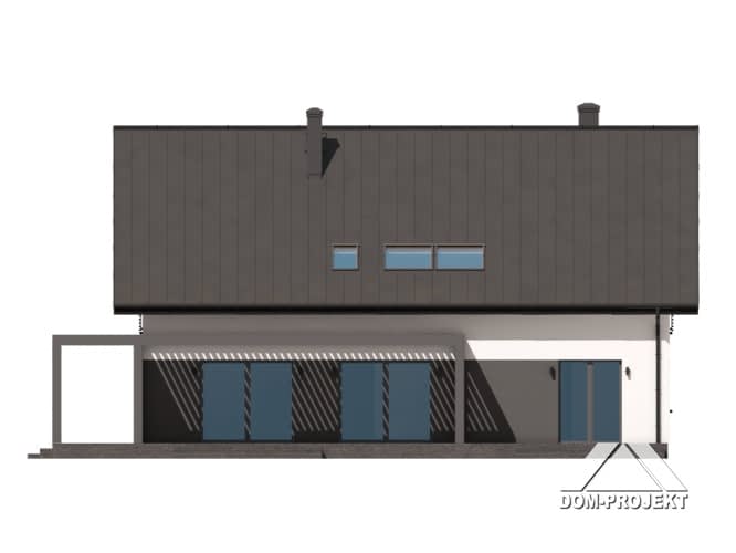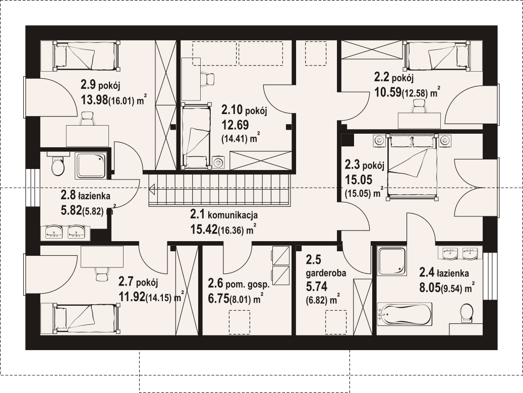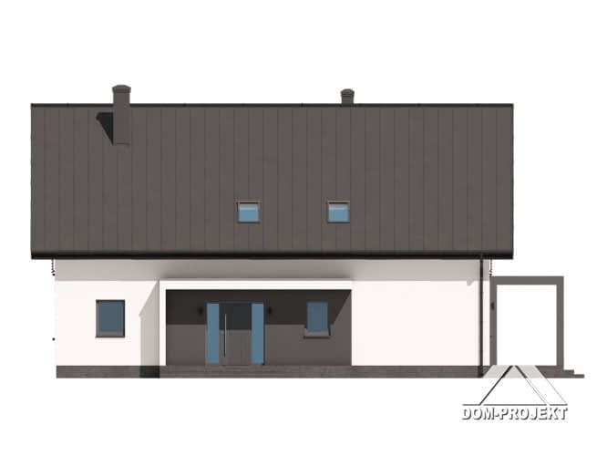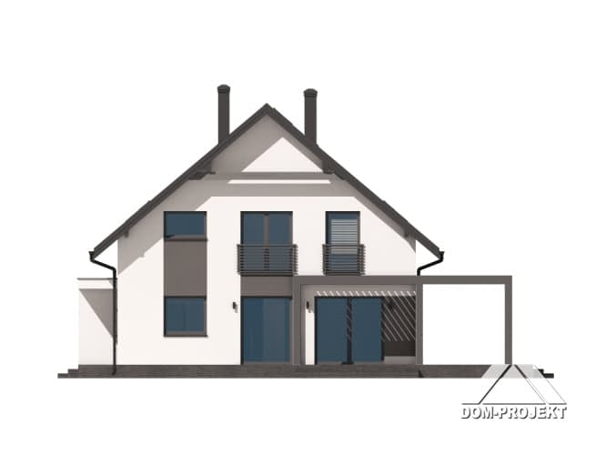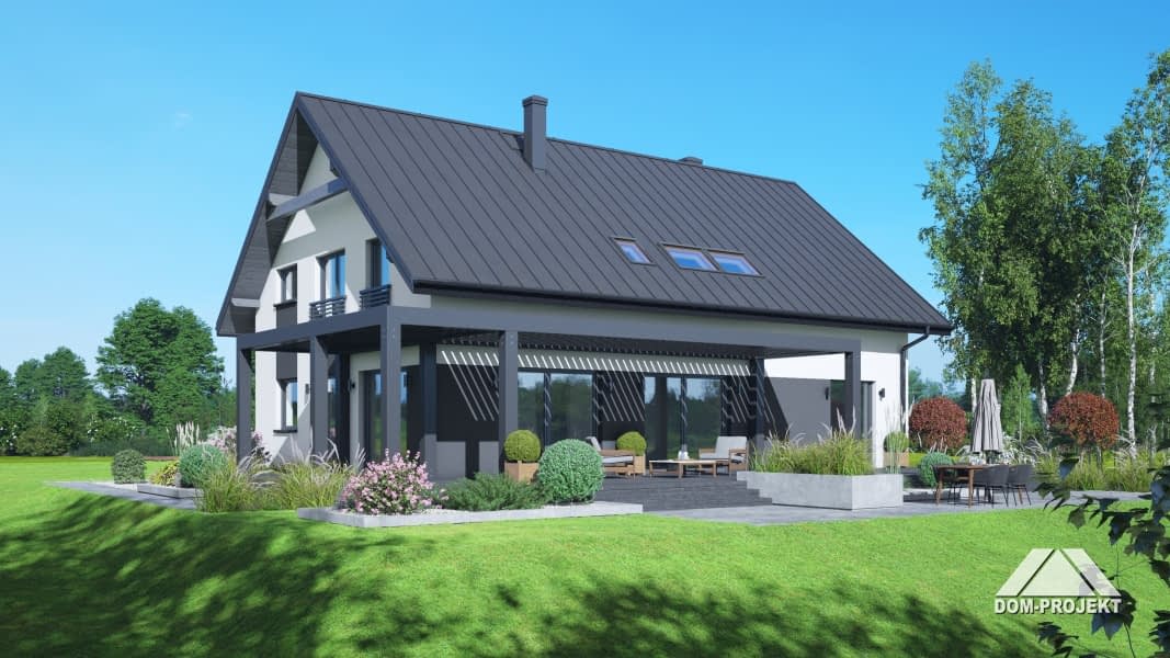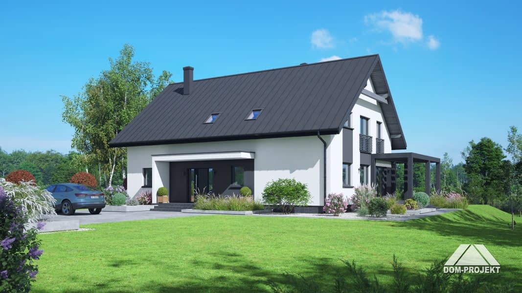 Projekt nowoczesnego domu z poddaszem użytkowym. Na parterze znajduje się duży, wygodny salon z kominkiem oraz wyjściem na taras. Otwarta kuchnia ma dostęp do pojemnej spiżarki. W kotłowni przewidzieliśmy miejsce na saunę. Program użytkowy parteru uzupełnia wiatrołap, łazienka oraz dodatkowy pokój. Na poddaszu aż pięć sypialni, w tym jedna z własną garderobą i łazienką oraz pomieszczenie gospodarcze i wspólna łazienka.Rzuty