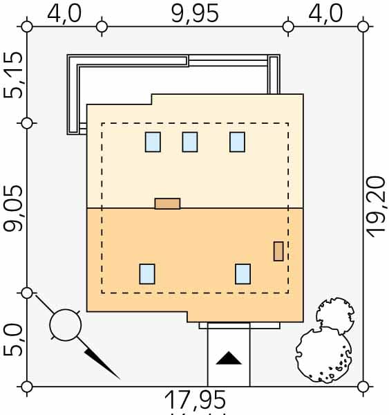 - Minimalne wymiary działki19.2 x 17.95m