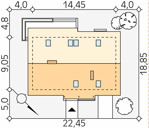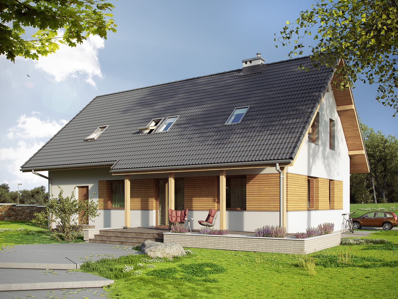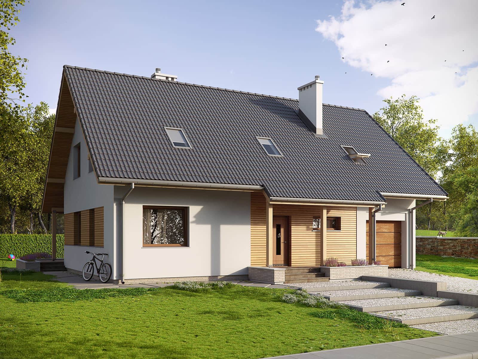 Średniej wielkości dom jednorodzinny z użytkowym poddaszem, garażem w bryle budynku. To dom idealny dla 5 -6-osobowej rodziny, który został zaprojektowany zgodnie z zasadami energooszczędności. Na poddaszu znajdują się cztery wygodne sypialnie, łazienka oraz pralnia. Atutem projektu jest optymalna przestrzeń i duża ilość sypialni.Konstrukcja