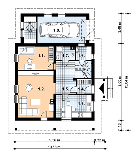 - sypialnia 11.50 pokój dzienny 22.40 kuchnia 10.90 wiatrołap 2.90 hall 10.40 kotłownia 2.80 łazienka 3.40 garaż 0.00 pom. gospodarcze 4.600