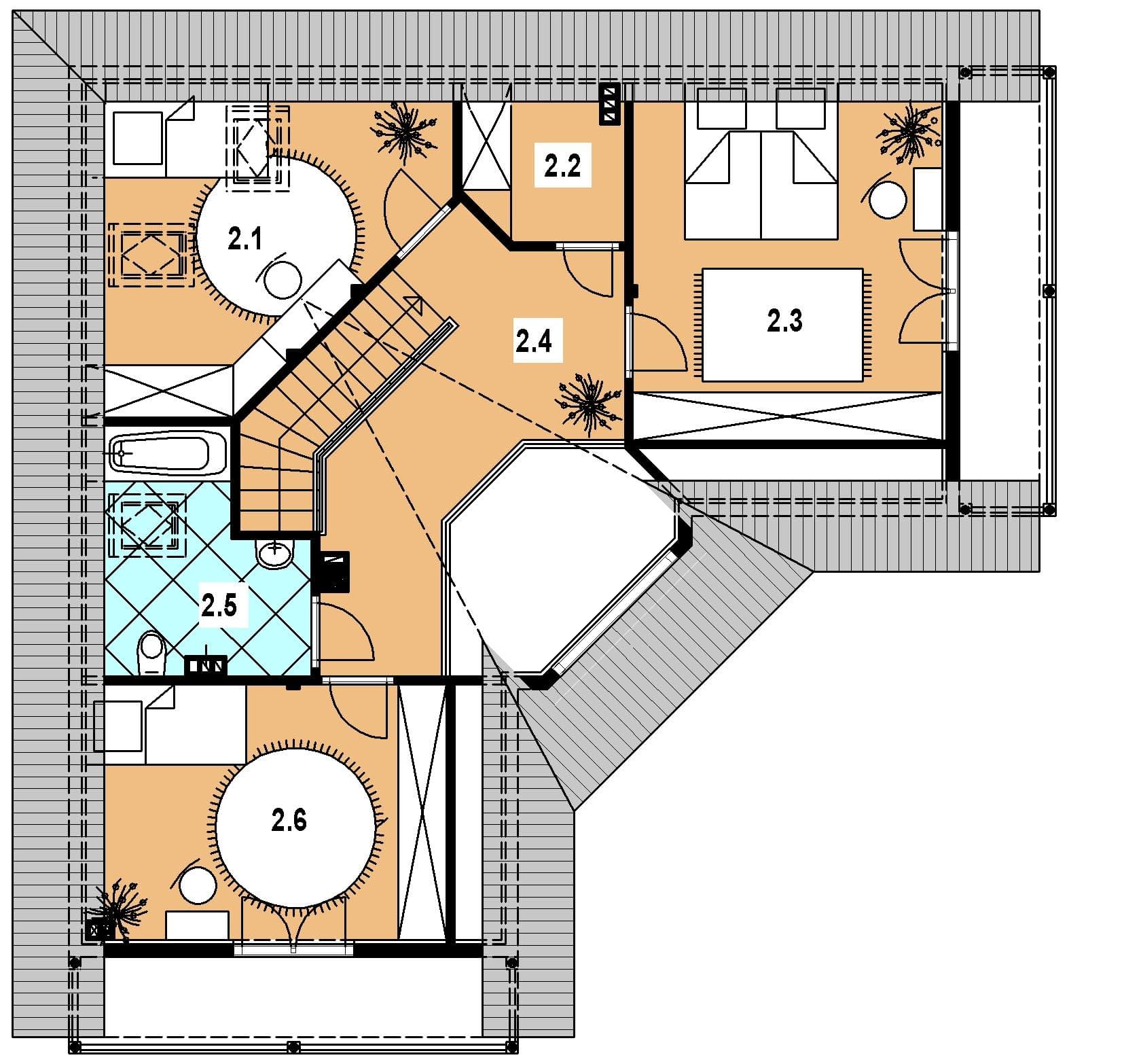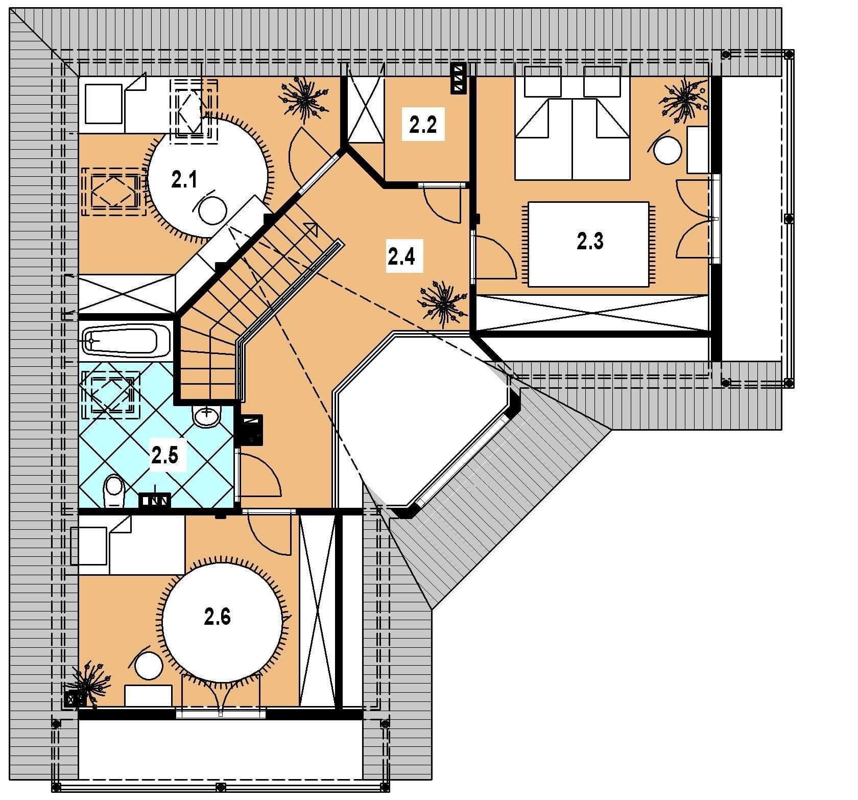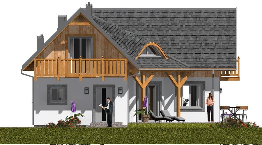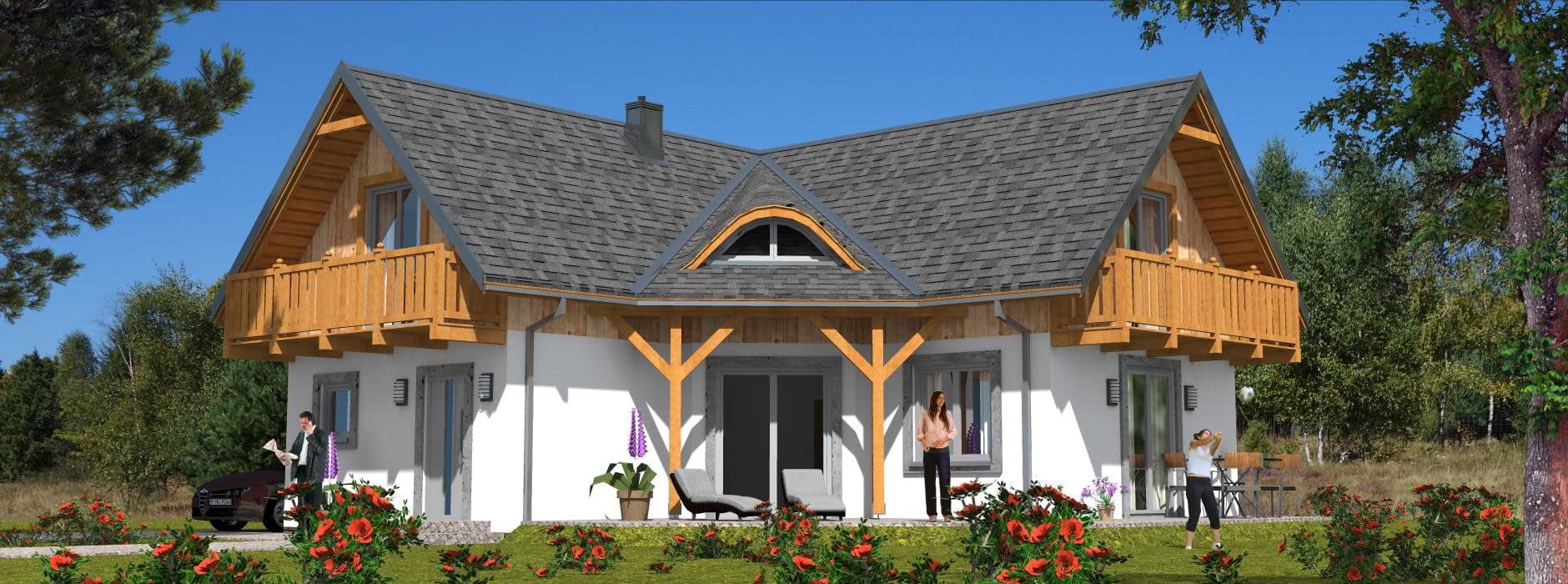 Projekt domu L-81 „DOM ODLEGŁA” – energooszczędny dom szkieletowy w kształcie litery L z poddaszem użytkowym Projekt domu L-81 „DOM ODLEGŁA” to funkcjonalny i nowoczesny dom w technologii szkieletowej, idealny dla inwestorów poszukujących lekkiej konstrukcji, krótkiego czasu realizacji i wysokiej energooszczędności. Bryła budynku została zaprojektowana w charakterystycznym kształcie litery L, co zapewnia prywatność ogrodu oraz wygodne rozplanowanie stref w domu. Wyróżniającym elementem projektu jest zadaszone wyjście na taras, nad którym umieszczono stylowe doświetlenie w formie wolego oczka. Ten architektoniczny detal nie tylko dodaje budynkowi elegancji, ale również naturalnie rozjaśnia wnętrze na poddaszu. Na parterze przewidziano przestronną część dzienną. Funkcjonalna kuchnia ze spiżarką łączy się z jasną jadalnią, tworząc idealne miejsce do codziennych posiłków i spotkań rodzinnych. Obok znajduje się komfortowa sypialnia, nowoczesna łazienka oraz dwa duże pomieszczenia gospodarcze, które w technologii szkieletowej można łatwo dostosować do indywidualnych potrzeb, np. na pralnię, kotłownię czy magazyn domowy. Dużym walorem projektu jest salon bez stropu, otwarty aż do więźby dachowej, co tworzy efekt imponującej wysokości i przestronności. Nad strefą dzienną znajduje się antresola, doskonała jako strefa wypoczynku lub pracownia. Z kolei schody na poddasze przechodzą nad pokojem dziennym, co stanowi charakterystyczny i atrakcyjny element architektoniczny dostępny w nowoczesnych domach szkieletowych. Poddasze oferuje trzy jasne sypialnie oraz dodatkową łazienkę. Dwa pokoje wyposażono w obszerne balkony, dzięki czemu użytkownicy poddasza zyskują prywatną przestrzeń do odpoczynku na zewnątrz. Projekt domu L-81 „DOM ODLEGŁA” realizowany w technologii szkieletowej to doskonałe rozwiązanie dla osób ceniących energooszczędność, elastyczność aranżacji oraz lekkość konstrukcji. To komfortowy, rodzinny dom zaprojektowany z myślą o nowoczesnym stylu życia.Rzuty