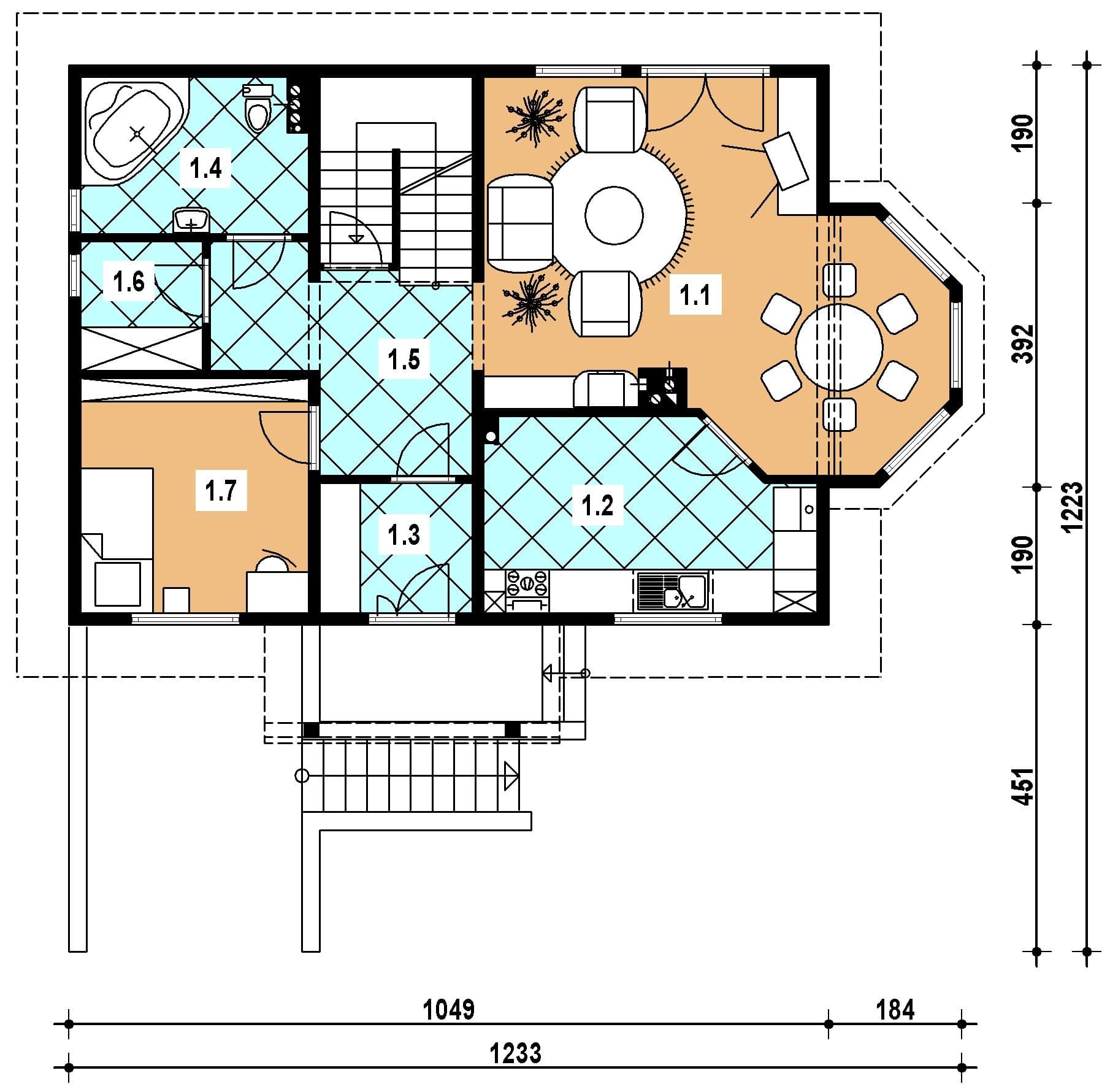- pokój dzienny 25.70 kuchnia 10.70 wiatrołap 3.50 łazienka 6.00 hall 11.20 pomieszczenie gosp. 2.80 sypialnia 9.500