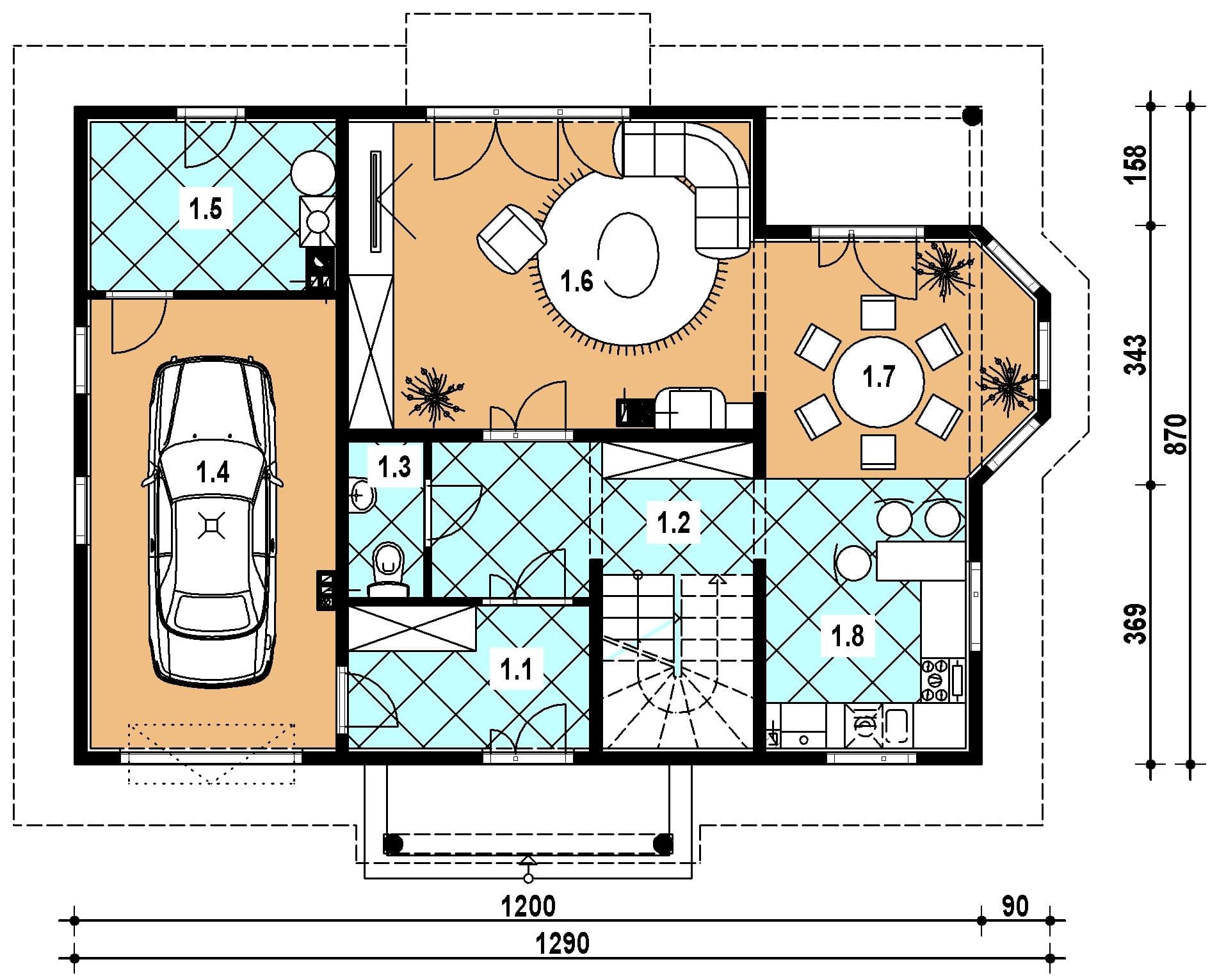 - wiatrołap 6.00 hall 10.30 wc 2.00 garaż 0.00 kotłownia 6.90 pokój dzienny 21.80 jadalnia 9.90 kuchnia 10.000