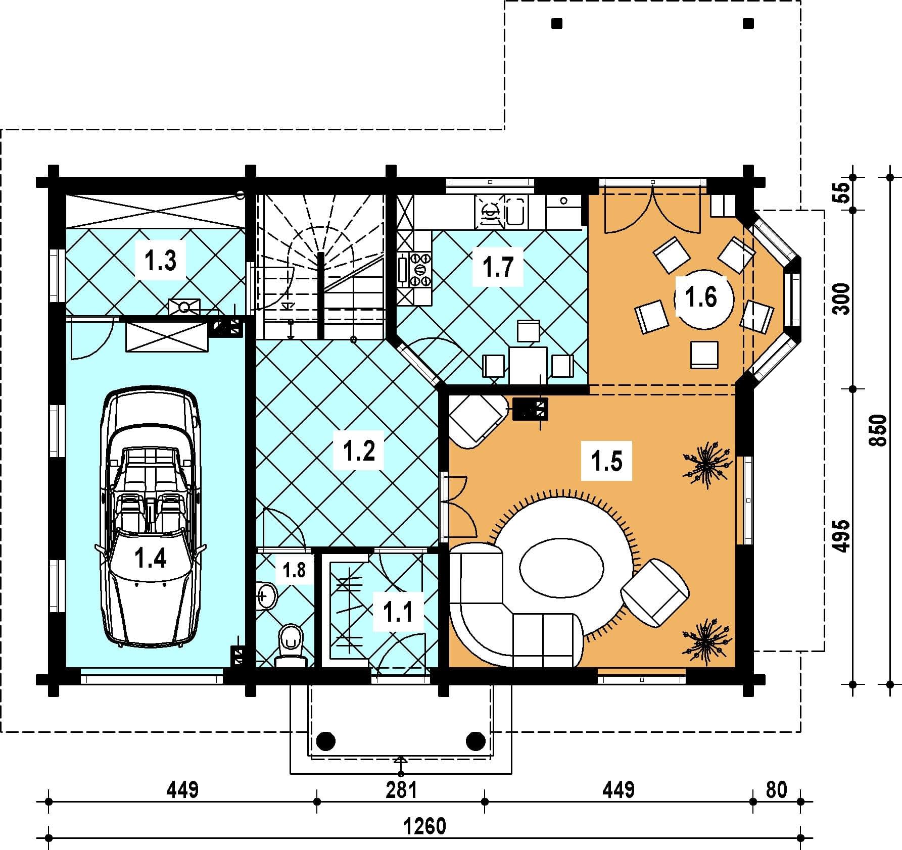 - wiatrołap 3.90 hall 13.70 kotłownia 6.50 garaż 0.00 pokój dzienny 22.30 jadalnia 9.80 kuchnia 9.90 wc 1.900