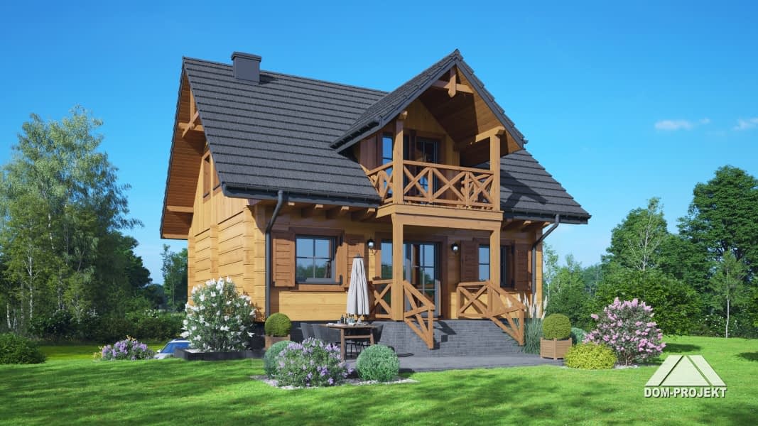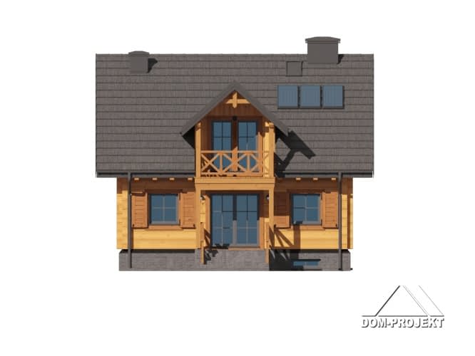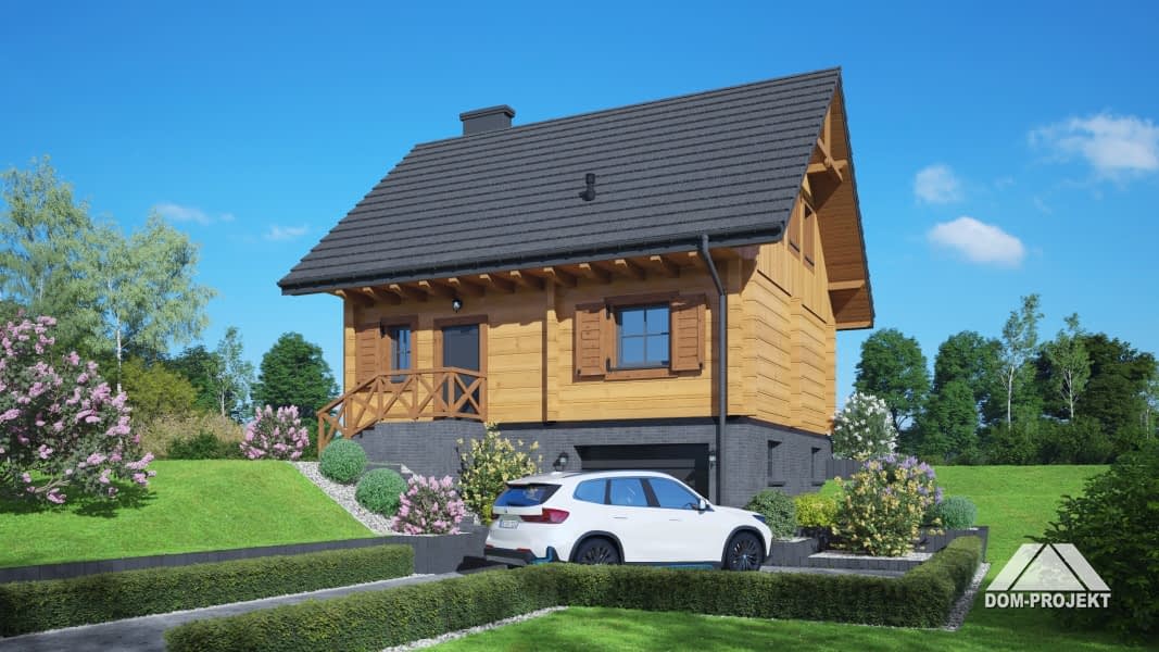Projekt wygodnego, praktycznego i szybkiego w budowie domu z bali, idealny na działkę za spadkiem terenu. Na parterze strefa dzienna, a w niej duży salon z kominkiem i wyjściem na taras oraz aneks kuchenny. Dodatkowo pokój, wc i łazienka. Na poddaszu cztery wygodne pokoje i wspólna łazienka. Budynek jest całkowicie podpiwniczony, a w piwnicy przewidzieliśmy garaż, pralnię oraz pomieszczenie gospodarcze.Rzuty