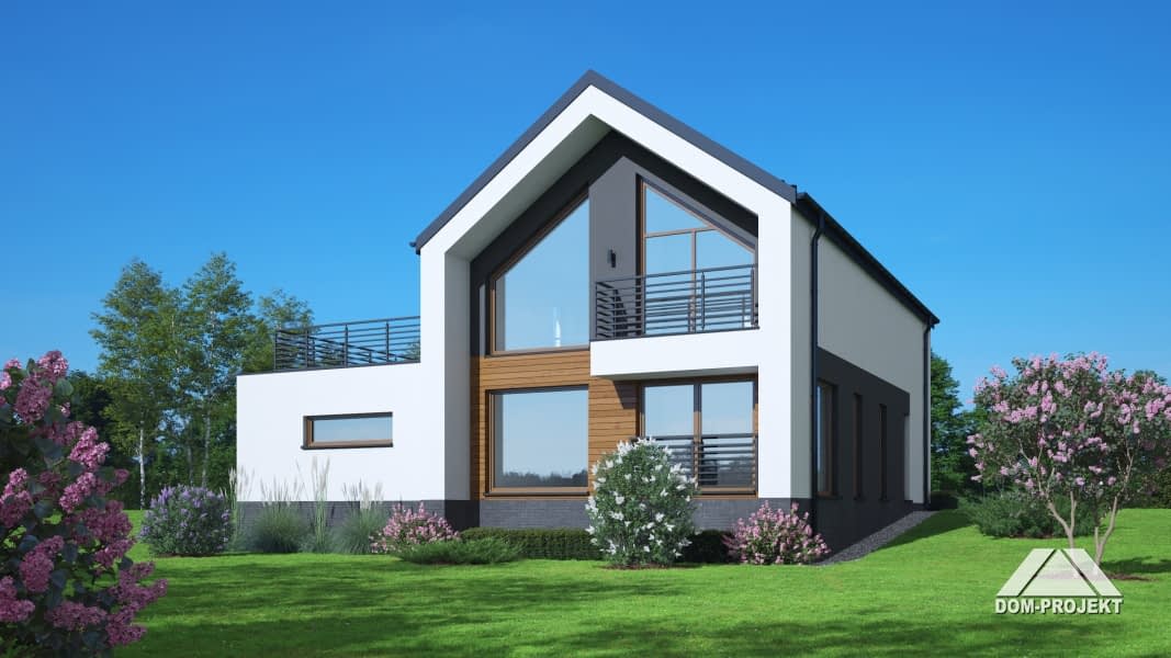 Projekt domu w stylu nowoczesnej stodoły. Na parterze wygodny salon z kominkiem i przeszkleniami. Otwarta kuchnia ma dostęp do praktycznej spiżarni. Dodatkowy pokój może pełnić rolę biura w domu lub sypialni. Przy garażu pomieszczenie gospodarcze - idealne miejsce na domową pracownię. Program użytkowy parteru uzupełnia łazienka i kotłownia. Na poddaszu trzy sypialnie - główna z własną garderobą i łazienką oraz wspólna łazienka. Prosta bryła budynku oraz dach dwuspadowy sprzyjają szybkiej i taniej budowie, obniżają koszty eksploatacji oraz nadają ponadczasowego charakteru.Rzuty