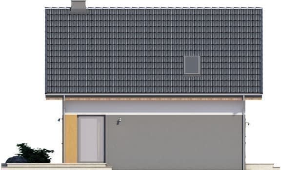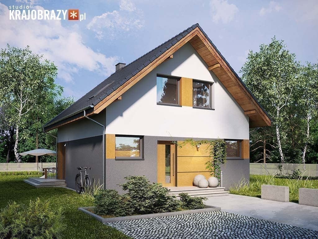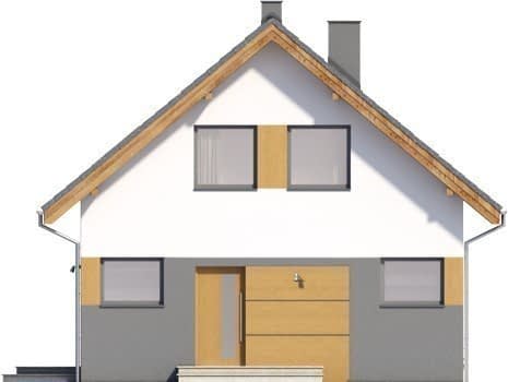 Lago - projekt małego domu z poddaszem bez garażu o powierzchni do 100m2. Posiada on ekonomiczny dach dwuspadowy z kalnicą prostopadłą do frontu i prostą, tanią w budowie bryłę budynku. Materiały zastosowane w obrębie symetrycznej strefy wejściowej i tarasu (okładzina drewniana oraz różne kolory tynków) dodają budynkowi elegancji i ładnie uzupełniają jego prostą formę. Z tyłu i boku budynku znalazły się duże okna z wyjściem na narożny taras.Parter podzielono na strefę dzienną, czyli salon z jadalnią i otwartą część kuchenną oraz część techniczną mieszczącą wc, spiżarnię, garderobę oraz pomieszczenie gospodarcze. Na piętrze ulokowano trzy pokoje sypialne oraz łazienkę. Dokumentację zamówić można również w wariancie lustrzanego odbicia.Rzuty