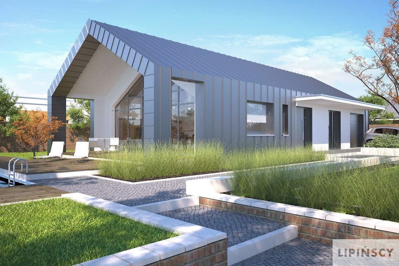 Kompaktowy parterowy dom o wyrazistym, nowoczesnym charakterze. Jest doskonały na działki z wjazdem od wschodu. Taras tego domu jest usytuowany z boku i tworzy wraz z zadaszeniem pokrytym drewnem intrygującą, przestronną przestrzeń. Stylistyka domu jest skierowana do osób o niestandardowych potrzebach estetycznych, dla tych którzy chcą się wyróżnić i podkreślić swoją oryginalność. Jednocześnie jest to dom o niewielkich parametrach powierzchniowych przez co jest atrakcyjny dla ludzi młodych i dla niewielkich rodzin. Wygodnie rozplanowany dom mieści w sobie przestrzeń pokoju dziennego, kuchnię z jadalnia i spiżarką, łazienkę i dwa pokoje, przy czym sypialnia większa ma niepowtarzalny charakter, dzięki dużym przeszkleniom. Dostępna jest również wersja tego projektu z płaskim dachem.