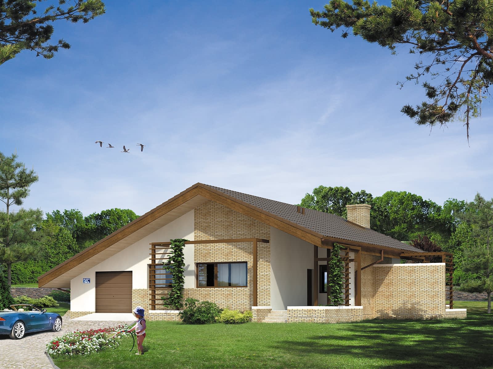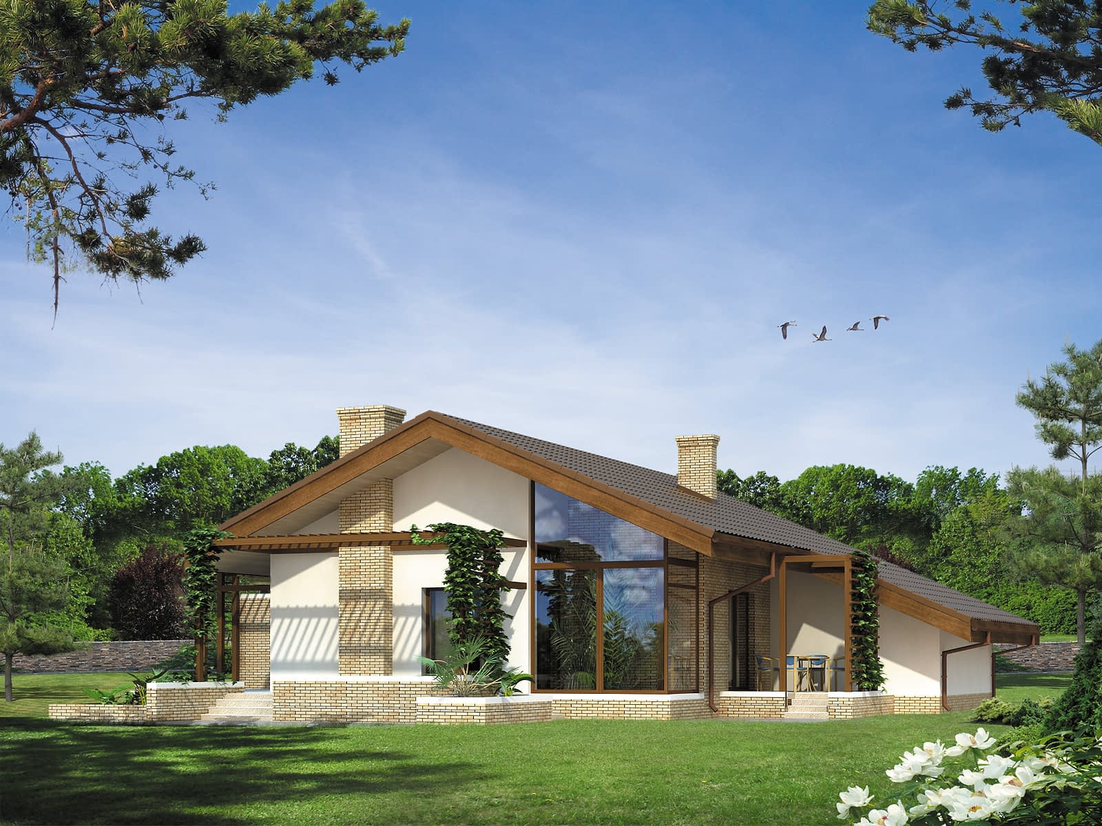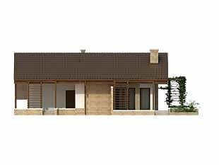 Efektowny jednorodzinny dom parterowy. Przejrzysty układ funkcjonalny, przewidziany dla 4-osobowej rodziny. Wyraźny podział na część dzienną i nocną. Duża część dzienna wzbogacona o ogród zimowy. Otwarty na otaczającą przestrzeń. Wzbogacony o szereg ciekawych tarasów, pergoli i murków.Konstrukcja