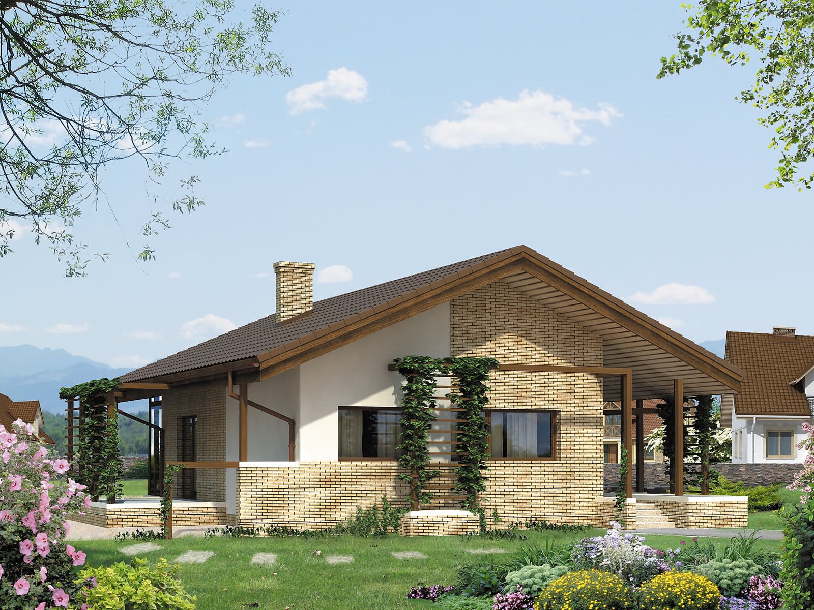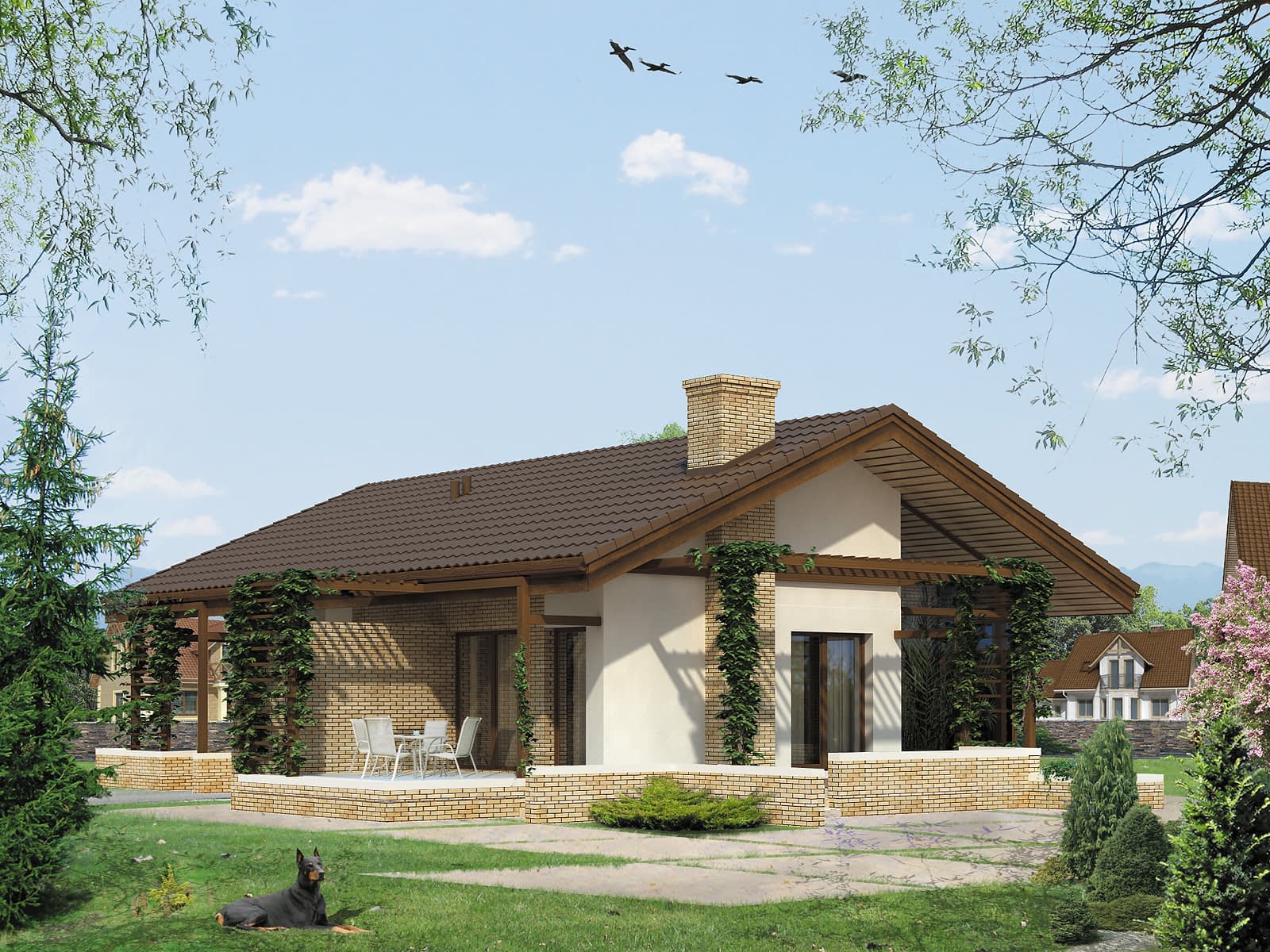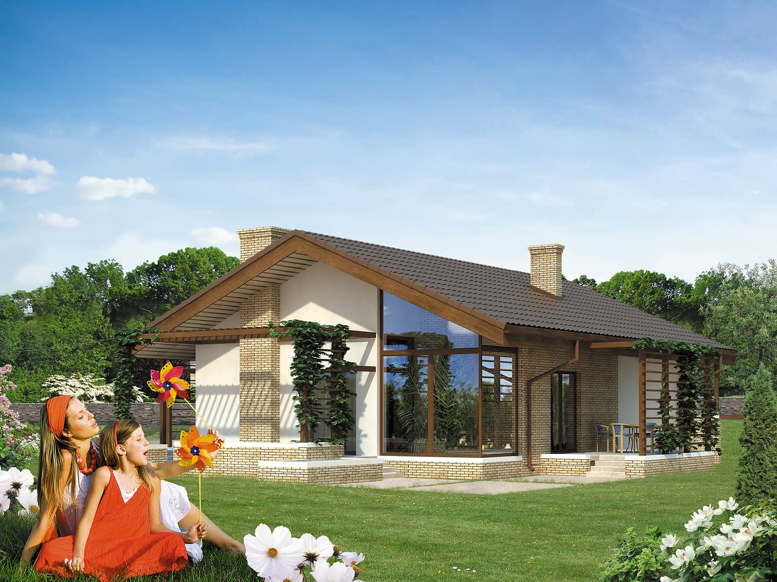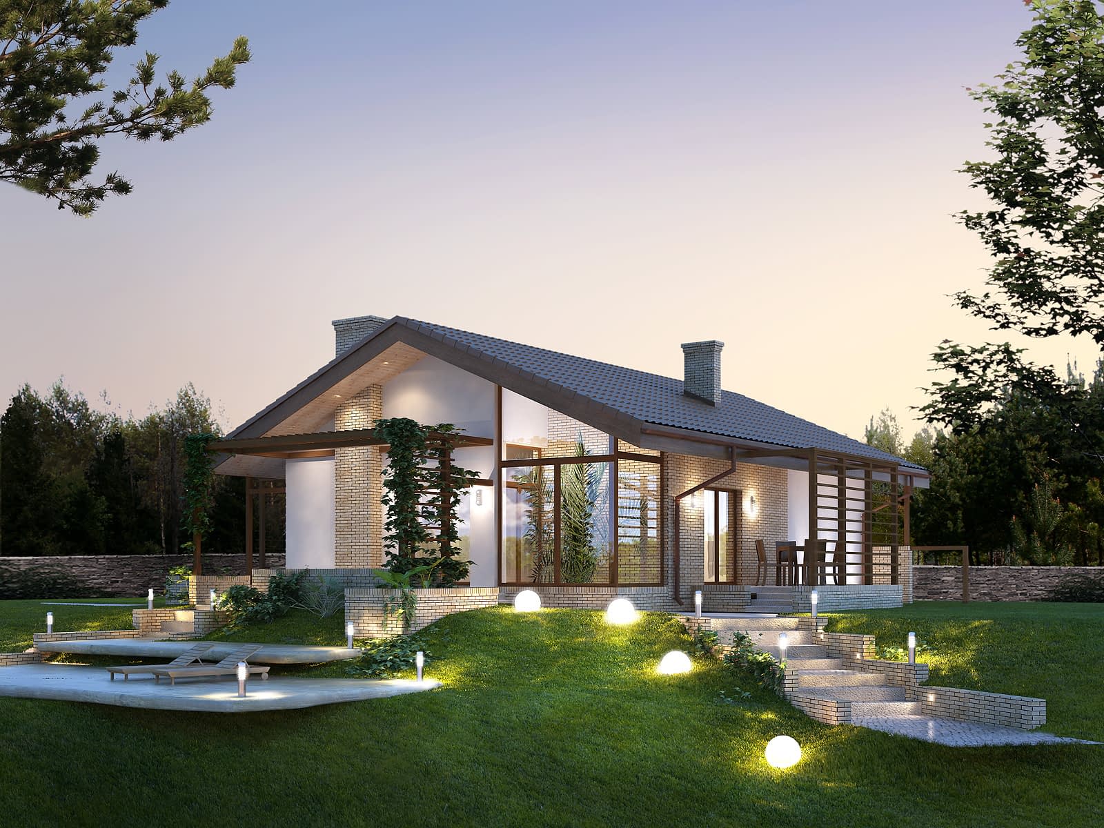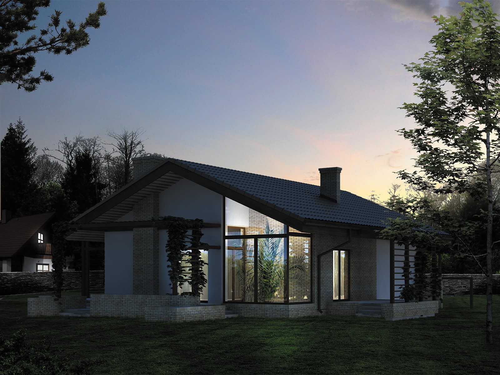Parterowy dom jednorodzinny o czystym układzie funkcjonalnym z wyraźnym podziałem na część dzienną i nocną. Przeznaczony dla 4-osobowej rodziny. Duża część dzienna wzbogacona doprojektowaną oranżerią, otwarta na otaczającą przestrzeń. Głównym założeniem projektu było połączenie i przenikanie się wnętrza domu z otoczeniem poprzez zaprojektowanie szeregu murków i pergoli.Konstrukcja