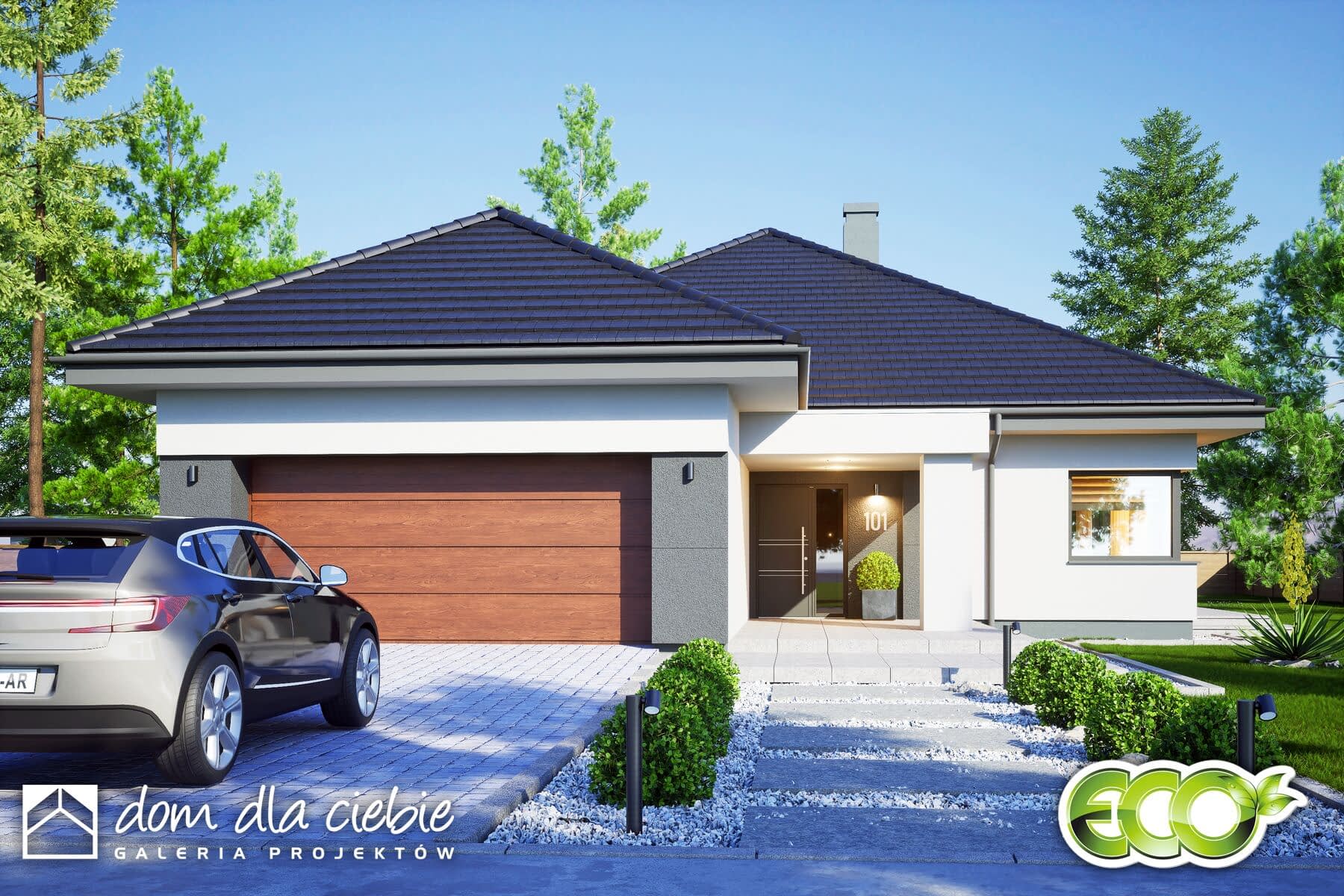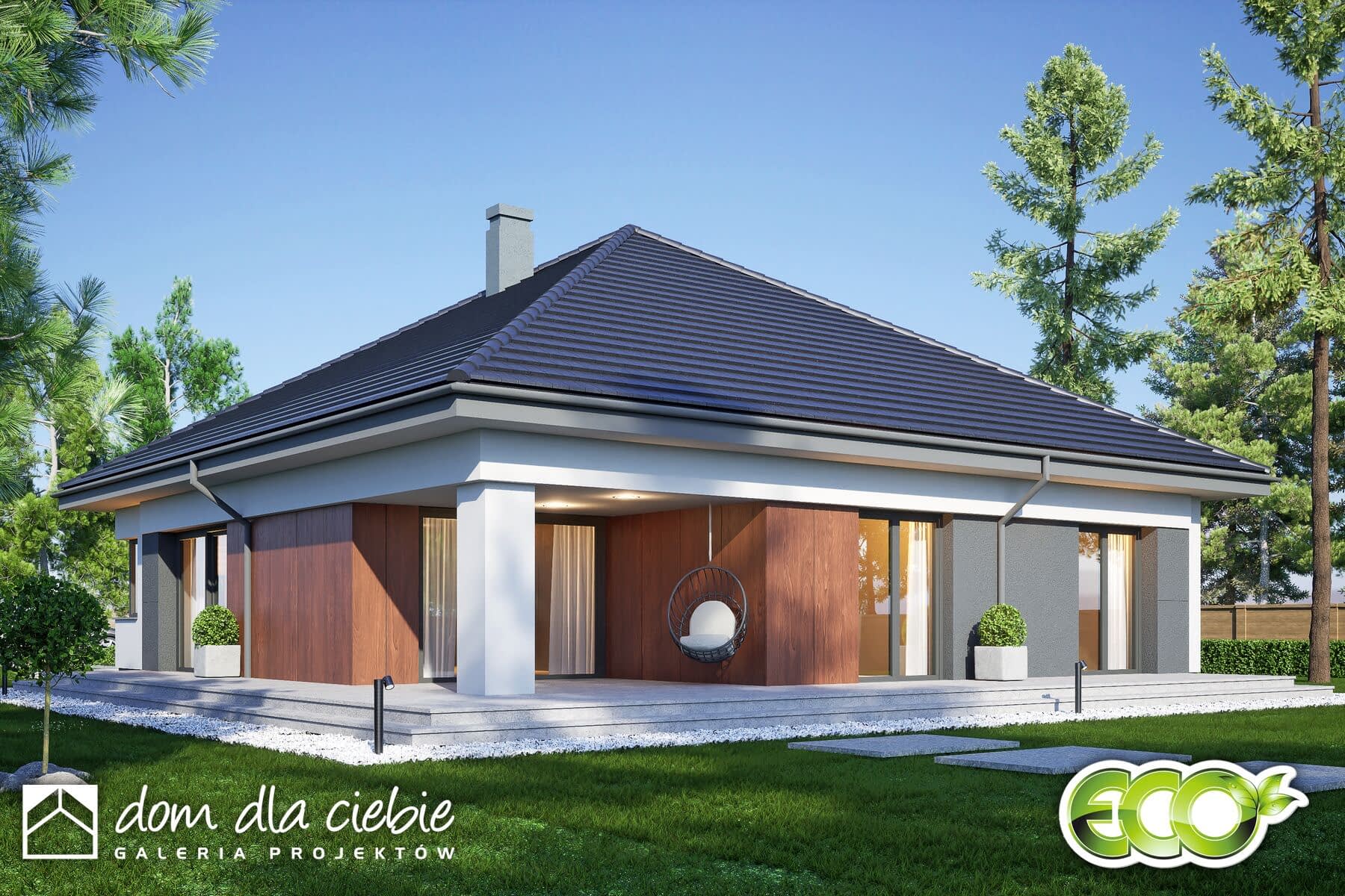 Projekt domu parterowego Laura z garażem dwustanowiskowym to nowoczesny dom dla 4ro osobowej rodziny. Dom zaprojektowano w technologii murowanej z tradycyjną więźbą dachową, przekryty jest spadzistym dachem wielospadowym. Laura to funkcjonalny projekt domu parterowego, łączący strefę ogólnodostępną i prywatną w jednym poziomie. W części wejściowej projekt przewiduje wygodny wiatrołap i hol z garderobą, toaletę, pralnię z której przewidziano dostęp do garażu oraz kotłowni. W części ogólnodostępnej zaprojektowano przestronny i dobrze doświetlony salon z miejscem na wygodny stół jadalniany z widokiem na ogród. Dzięki dużym drzwiom tarasowym od strony ogrodu, dostaniemy się wprost na obszerny taras zewnętrzny, zadaszony praktycznym podcieniem. Przy salonie od strony frontowej przewidziano wygodną kuchnię z wyspą i spiżarnią. Do części prywatnej dostaniemy się przez korytarz dostępny z holu wejściowego. W części prywatnej mamy do dyspozycji trzy pokoje sypialne w tym jeden typu master bedroom, przewidziano tu też wygodną, wspólną łazienkę z wanną. Laura to atrakcyjna propozycja domu energooszczędnego, o nowoczesnym wyglądzie. To projekt domu z serii "eco" - ekonomiczny w budowie i w utrzymaniu - idealna propozycja dla rodzin planujących budowę pierwszego domu.