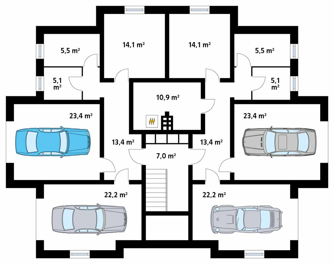 Dom mieszkalny 4-mieszkaniowy, podpiwniczony, dwukondygnacyjny. Na każdej kondygnacji zaprojektowano po dwa mieszkania przeznaczone dla 3 – 4-osobowych rodzin. Dom 4-mieszkaniowy może być wspaniałą alternatywą dla rodzin pragnących mieszkać w zacisznych osiedlach domów jednorodzinnych. W piwnicy zaprojektowano część gospodarczą oraz cztery garaże.Konstrukcja