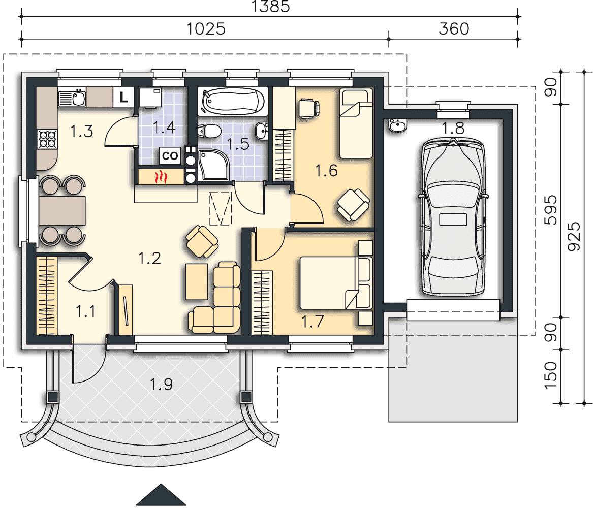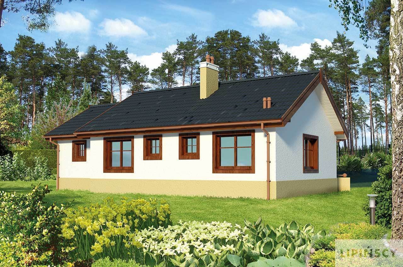 Niewielki domek parterowy, z jednostanowiskowym garażem, doskonałe połączenie atrakcyjnego wyglądu z funkcjonalnym i niewielkim, ale wygodnym wnętrzem. Do środka zaprasza ciekawie zaprojektowany, zadaszony ganek , pełniący równocześnie funkcję tarasu, na którym znajdzie się miejsce na ławeczkę i stolik. Do dyspozycji mieszkańców jest salon z kominkiem, kuchnia z miejscem na stół, dwie sypialnie, łazienka i pomieszczenie gospodarcze z miejscem na pralkę. Projekt Leeds II to ciekawa propozycja tradycyjnego domu, taniego w budowie i eksploatacji, ale nie pozbawionego uroku.