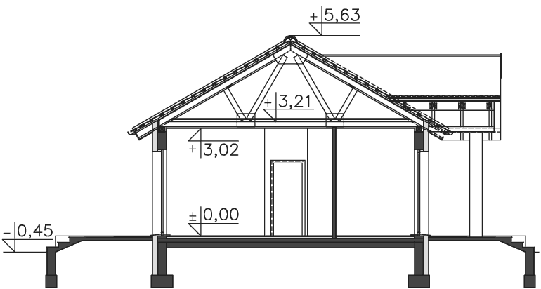 Piękny parterowy dom z dwuspadowym dachem o układzie funkcjonalnym zaprojektowanym z myślą o małej rodzinie. Wyjątkowo w tej wersji projektu kuchnia została zaprojektowana od strony frontowej, z dużym oknem wychodzącym na zadaszony taras wejściowy. Drugi taras znajduje się od strony saloniku otwartego na ogród. W budynku przewidziany jest też jest garaż pod wspólnym dachem, do którego można wejść bezpośrednio z domu. Za garażem znajduje się kotłownia, dzięki temu wnętrze domu to tylko pomieszczenia mieszkalne: pokój dzienny z kuchnią i kominkiem, dwie sypialnie, łazienka. Taki układ funkcjonalny w zupełności wystarczy do wygodnego mieszkania dla młodej rodziny lub seniorów.
