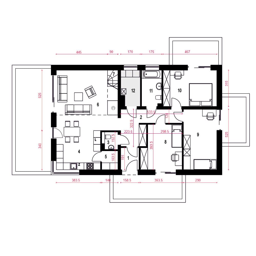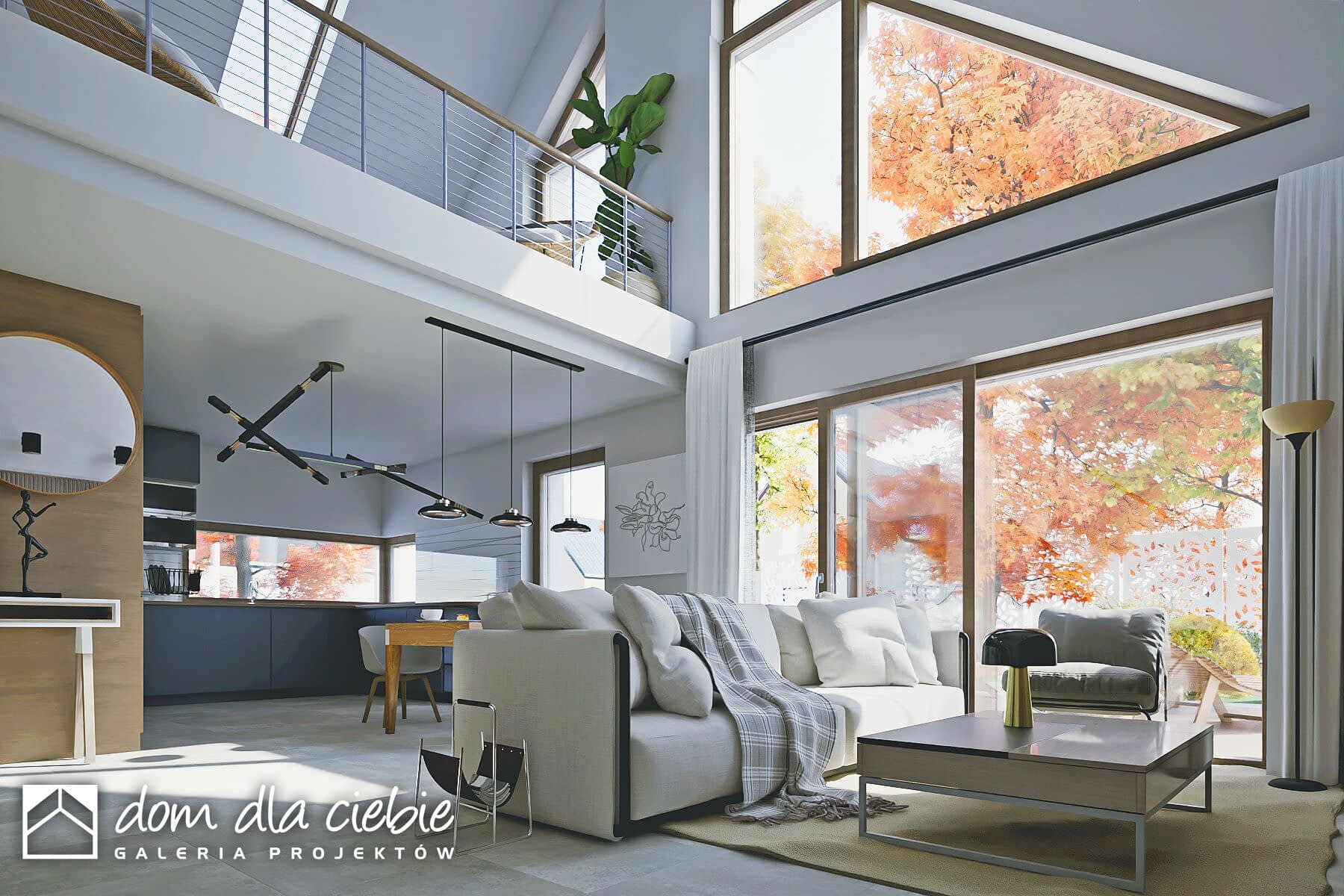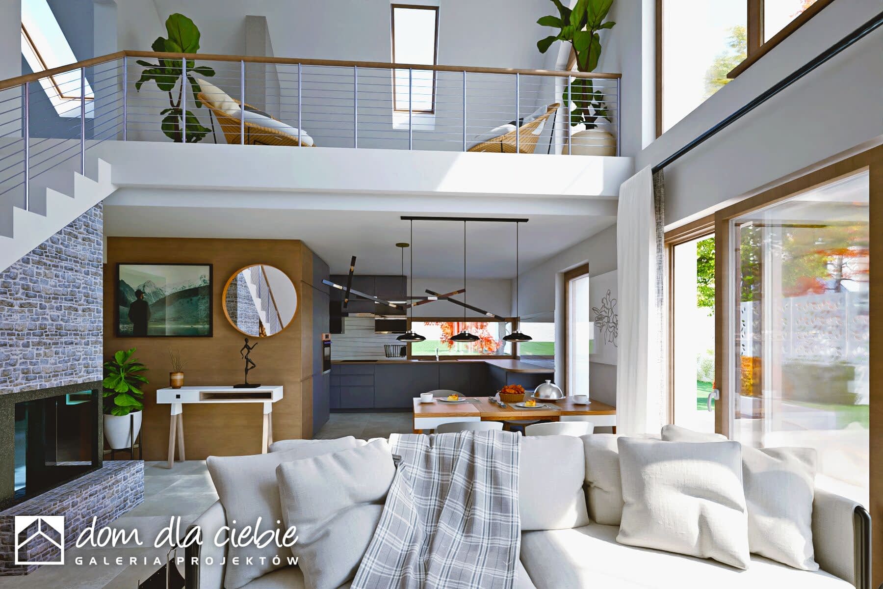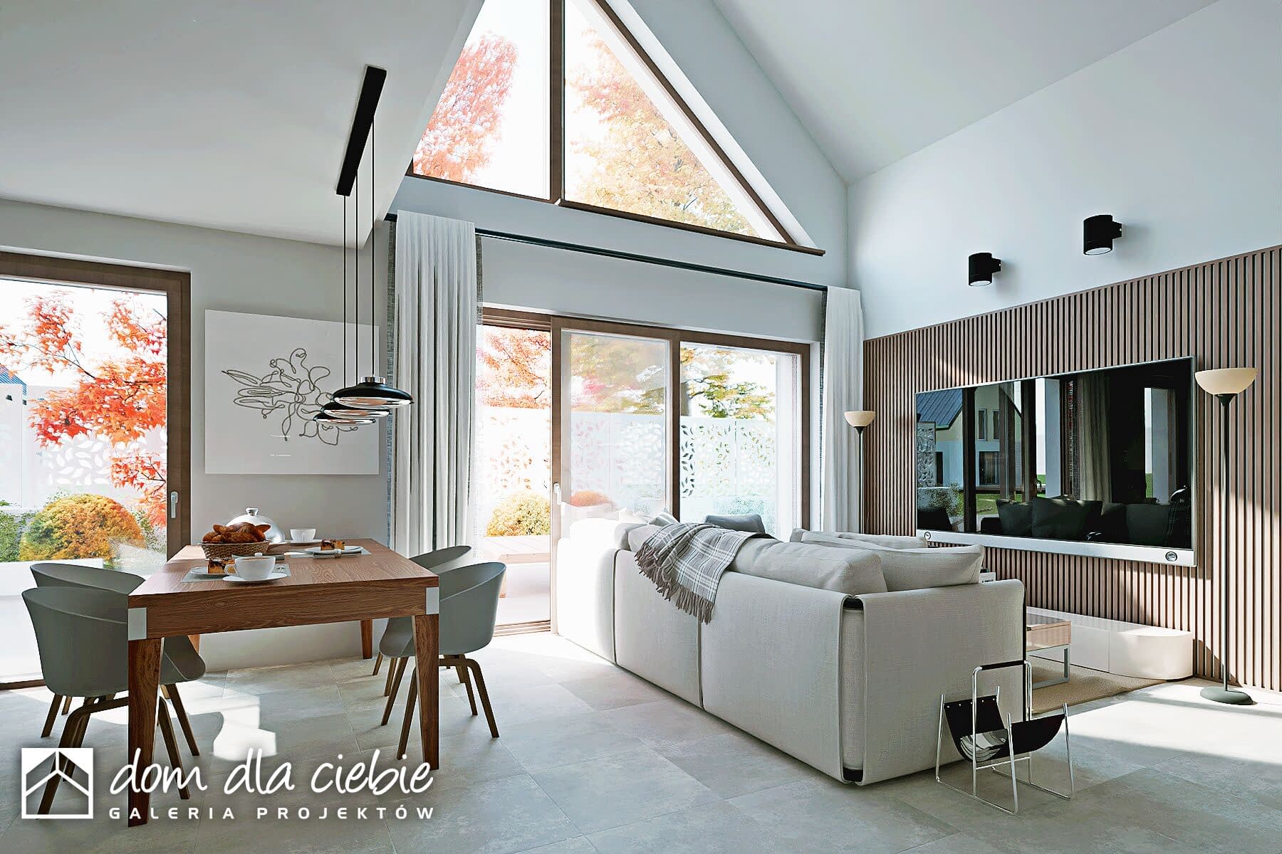 Lena to nowoczesny dom z poddaszem do adaptacji, wyróżniający się prostą bryłą, dużymi przeszkleniami i elegancką białą elewacją ze szarą dachówką.Na parterze zaplanowano trzy sypialnie oraz przestronną strefę dzienną z salonem, kuchnią i jadalnią z wyjściem na taras. Dodatkowo przewidziano łazienkę, wc, spiżarnię, pomieszczenie techniczne i wygodne wejście z miejscem na szafy.Poddasze pozostaje otwarte na aranżację – można tam stworzyć dodatkowe pokoje, łazienkę, gabinet lub przestrzeń rekreacyjną.Dom łączy nowoczesny wygląd z funkcjonalnością i dbałością o środowisko