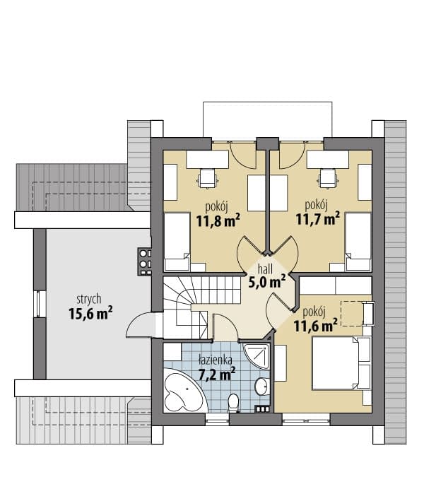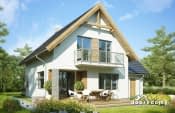 Nieduży, ale wygodny i praktyczny dom dla 4-5-osobowej rodziny. Na parterze zaplanowano kuchnię, pokój dzienny połączony przestrzennie z jadalnią, spiżarnię oraz łazienkę. Z wiatrołapu jest przejście do jednostanowiskowego garażu, a dalej do pomieszczenia gospodarczego. Poddasze to strefa nocna - z trzema pokojami i przestronną łazienką, oraz strych. Projekt można wykorzystać do zabudowy bliźniaczej.