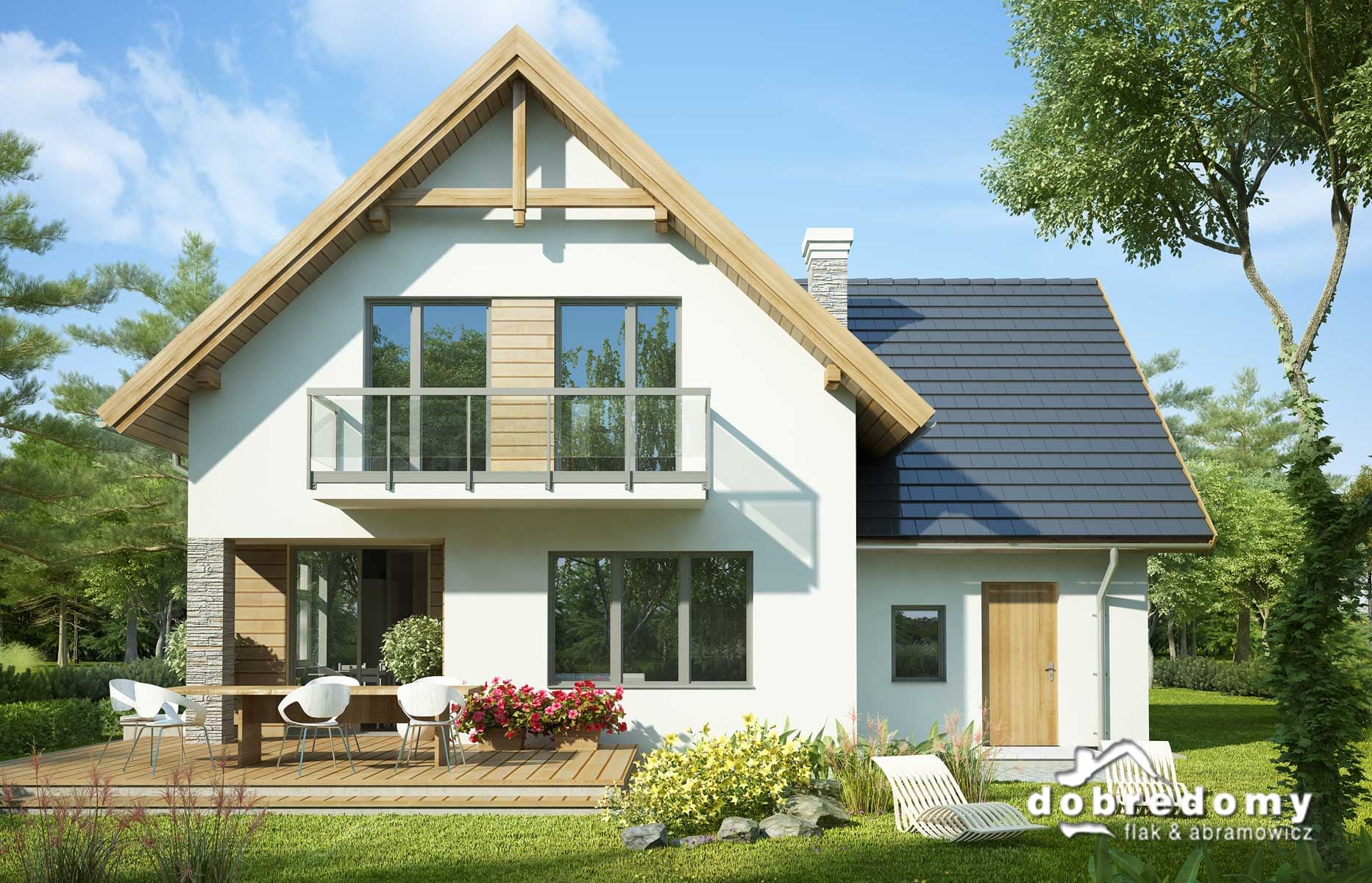 Elewacje pokryte tynkiem strukturalnym w systemie ociepleń Termo Organika oraz okładziną drewnianą i kamienną. W projekcie zastosowano okna dachowe marki FAKRO. Pokrycie dachu - dachówka ceramiczna lub cementowa CREATON.