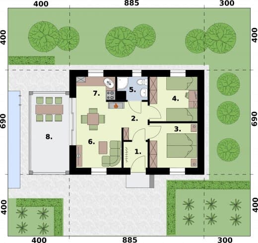 - Minimalne wymiary działki15.85 x 14.9m