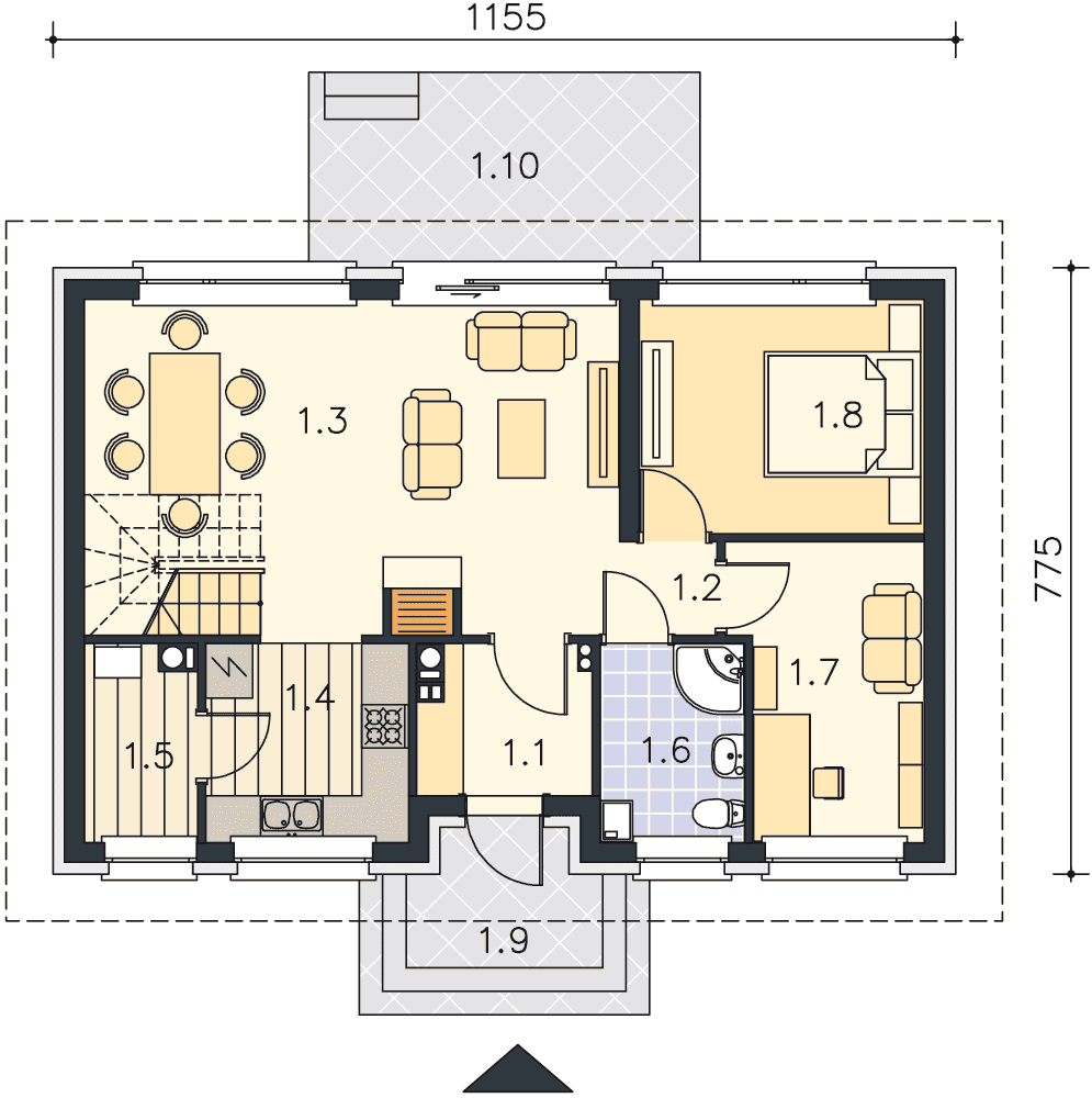 Niewielki dom o prostej bryle i dwuspadowym dachu wygodnie pomieści cztero-, pięcioosobową rodzinę. Dzięki prostej konstrukcji i bryle jest tani w wykonaniu. Funkcjonalne wnętrze jest niewątpliwym atutem tego projektu. Połączony z częścią jadalną salon i otwarta kuchnia podkreślają poczucie przestrzenności. Obok kuchni zaprojektowano pomieszczenie gosp. Duże przeszklenia w salonie pozwalają cieszyć się bliskością natury. Dwa pokoje na parterze w roli sypialni sprawdzą się w dwuetapowej realizacji domu. Dwie sypialnie na poddaszu, garderoba, wygodna łazienka oraz przytulny kącik wypoczynkowy podnoszą komfort użytkowania tego domu.