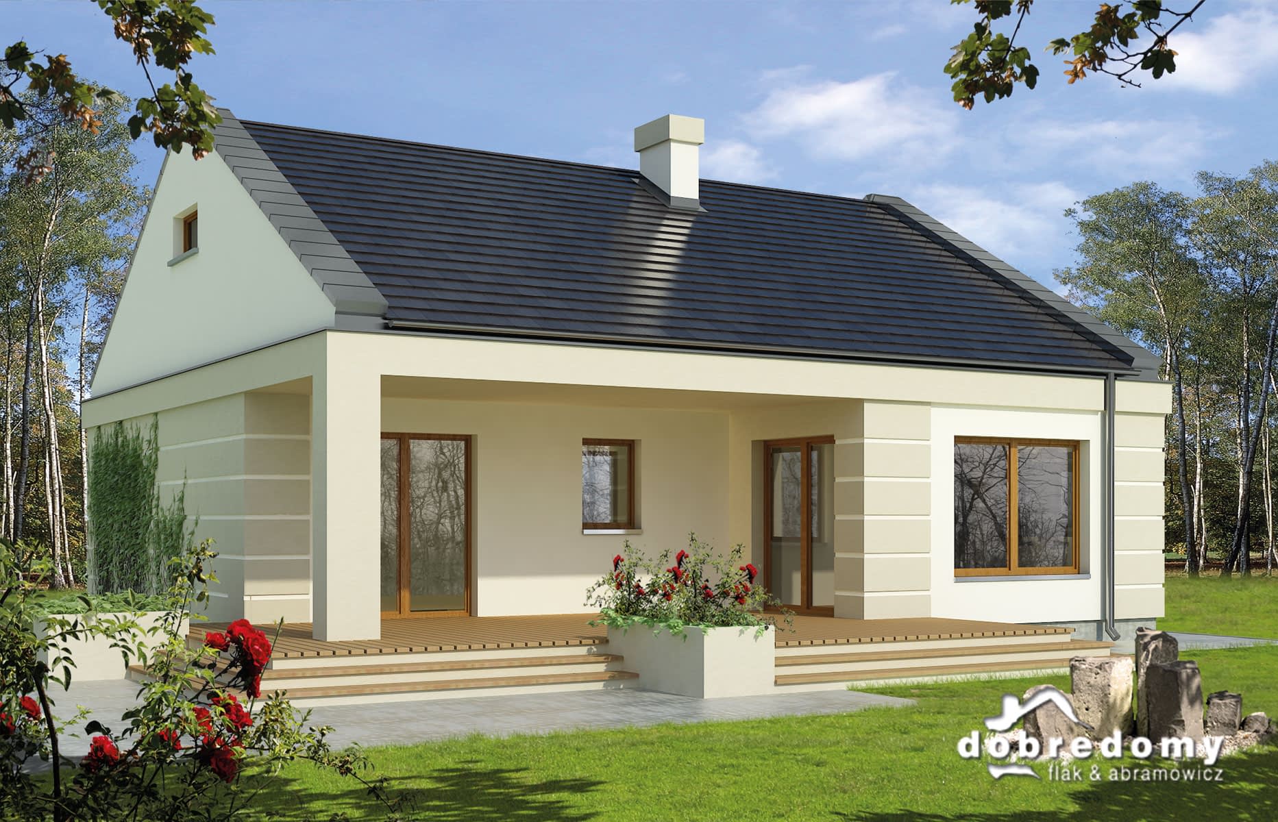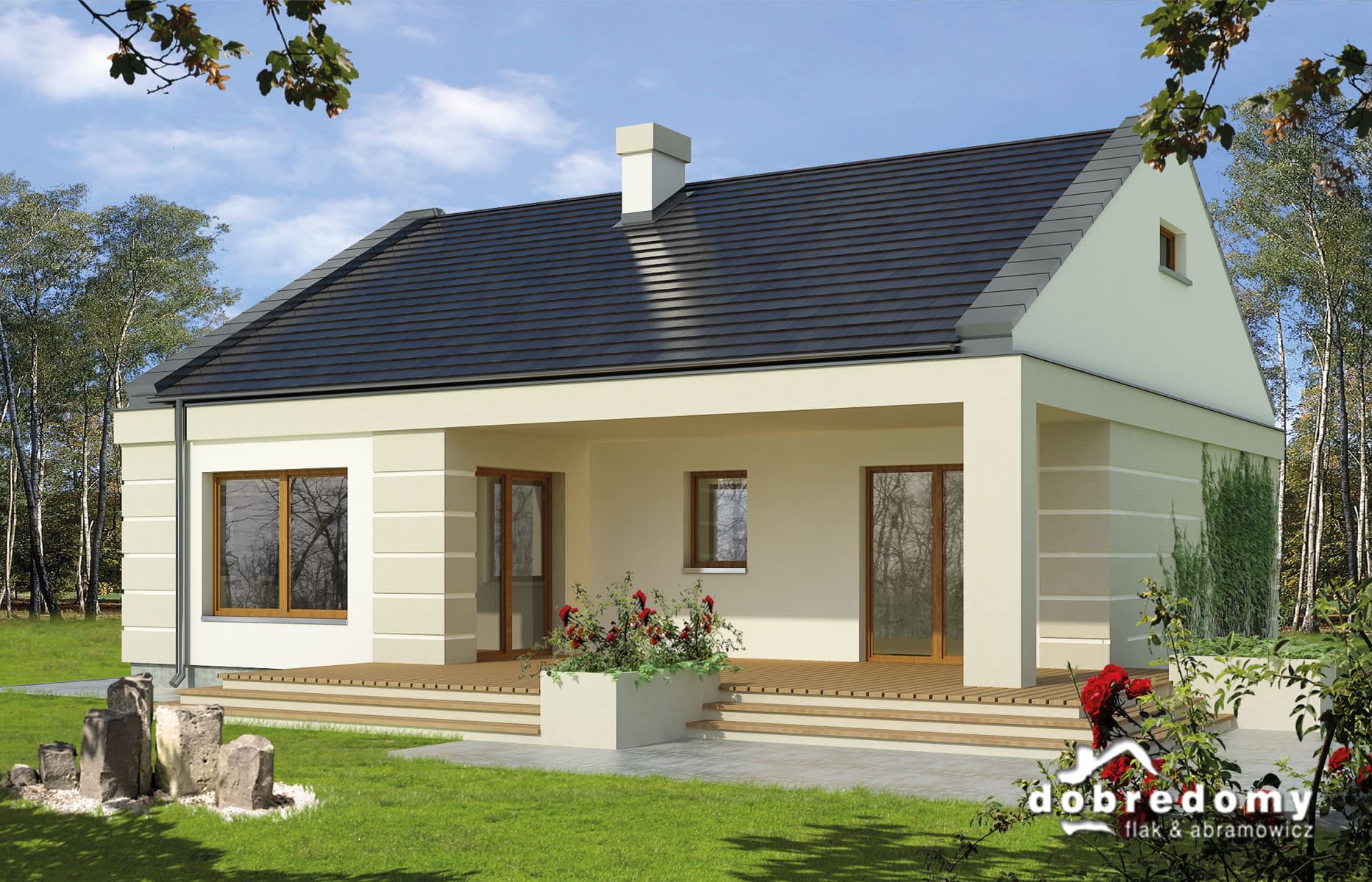 Elewacje pokryte tynkiem strukturalnym w systemie ociepleń Termo Organika. Pokrycie dachu - dachówka ceramiczna lub cementowa CREATON.