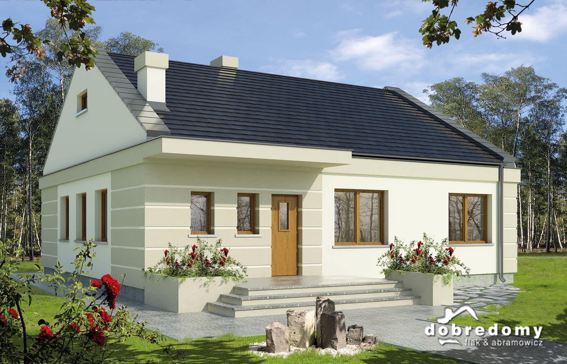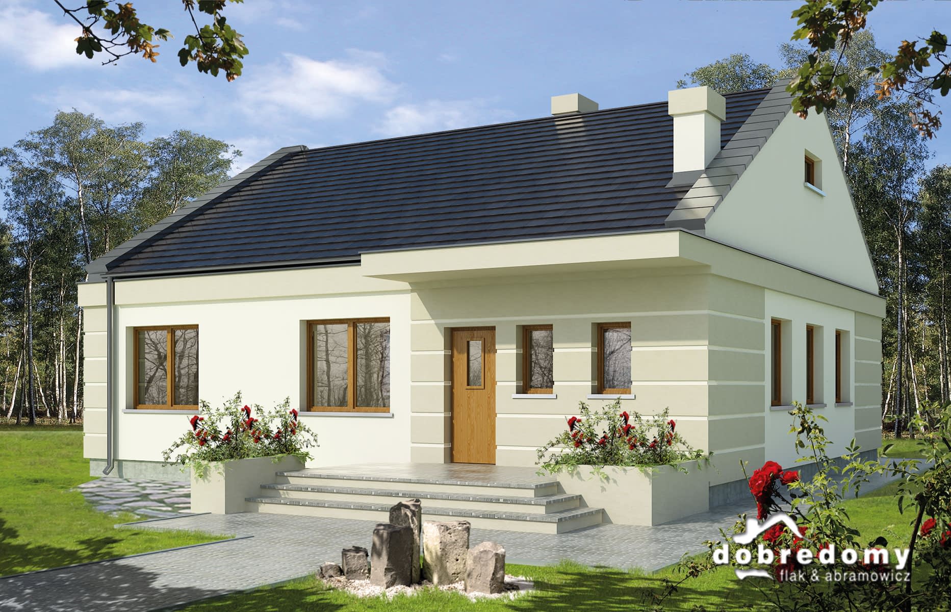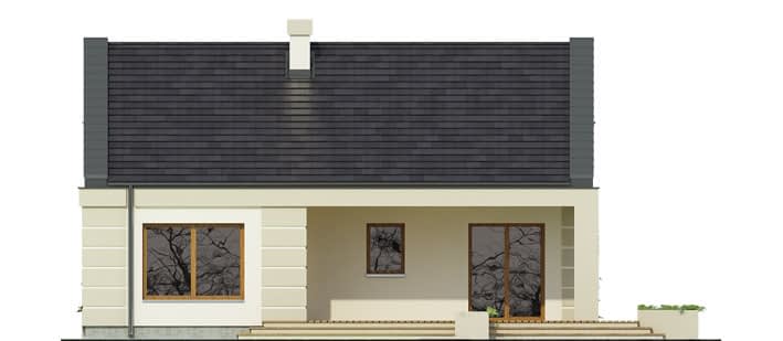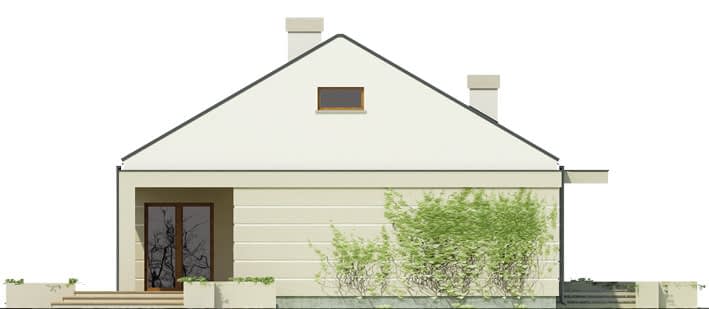 Dom parterowy, przeznaczony dla 4-osobowej rodziny. Układ pomieszczeń podzielono na dwie strefy: dzienną i nocną. Część dzienną stanowi otwarta przestrzeń salonu z jadalnią i kuchnią. Możliwe jest również zamknięcie kuchni. Część nocna składa się z ogólnodostępnej łazienki oraz trzech sypialni. Z hallu dostępne jest WC, natomiast pomieszczenie gospodarcze dostępne jest z wiatrołapu. Projekt można zbliźniaczyć.
