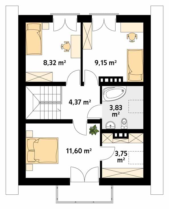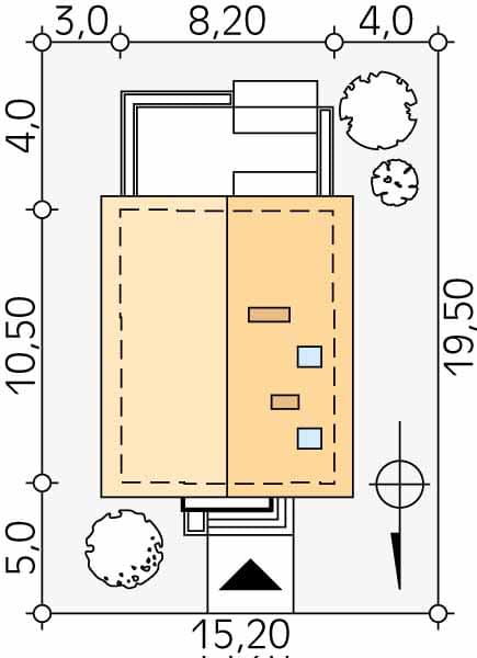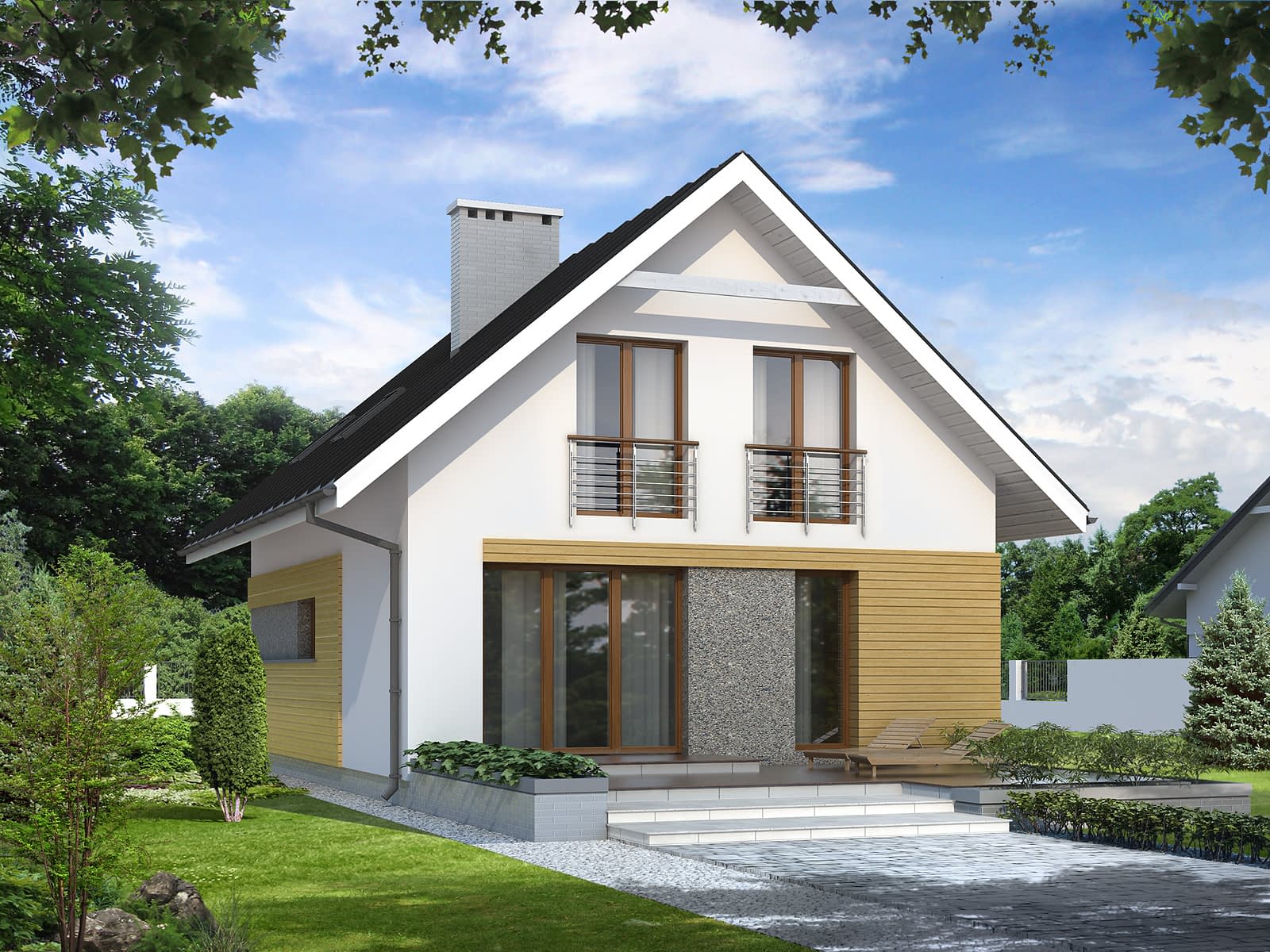Niewielki dom parterowy z użytkowym poddaszem, przeznaczony dla 4-osobowej rodziny. Na parterze obok części dziennej przewidziano dodatkowy pokój oraz kotłownię na paliwo stałe. Dużym atutem projektu jest przestronny taras wtapiający się w otoczenie. Projekt idealny na wąską działkę.Konstrukcja