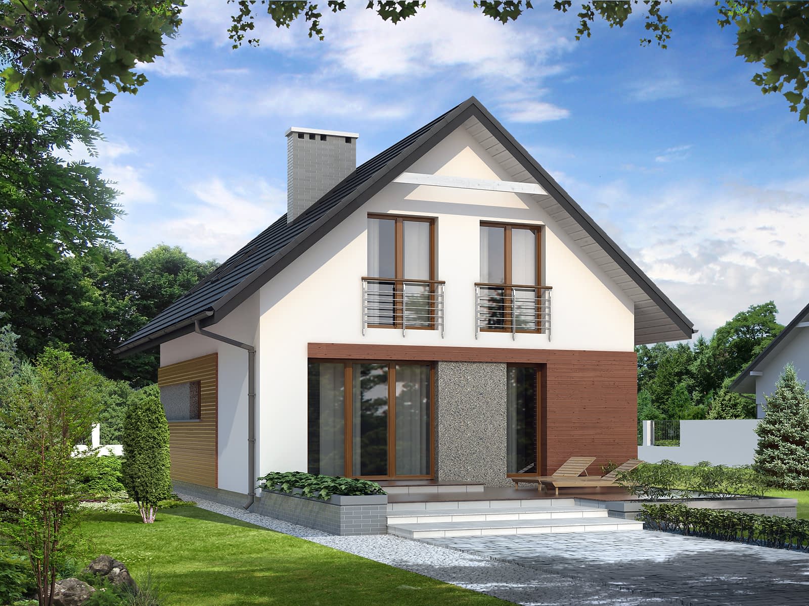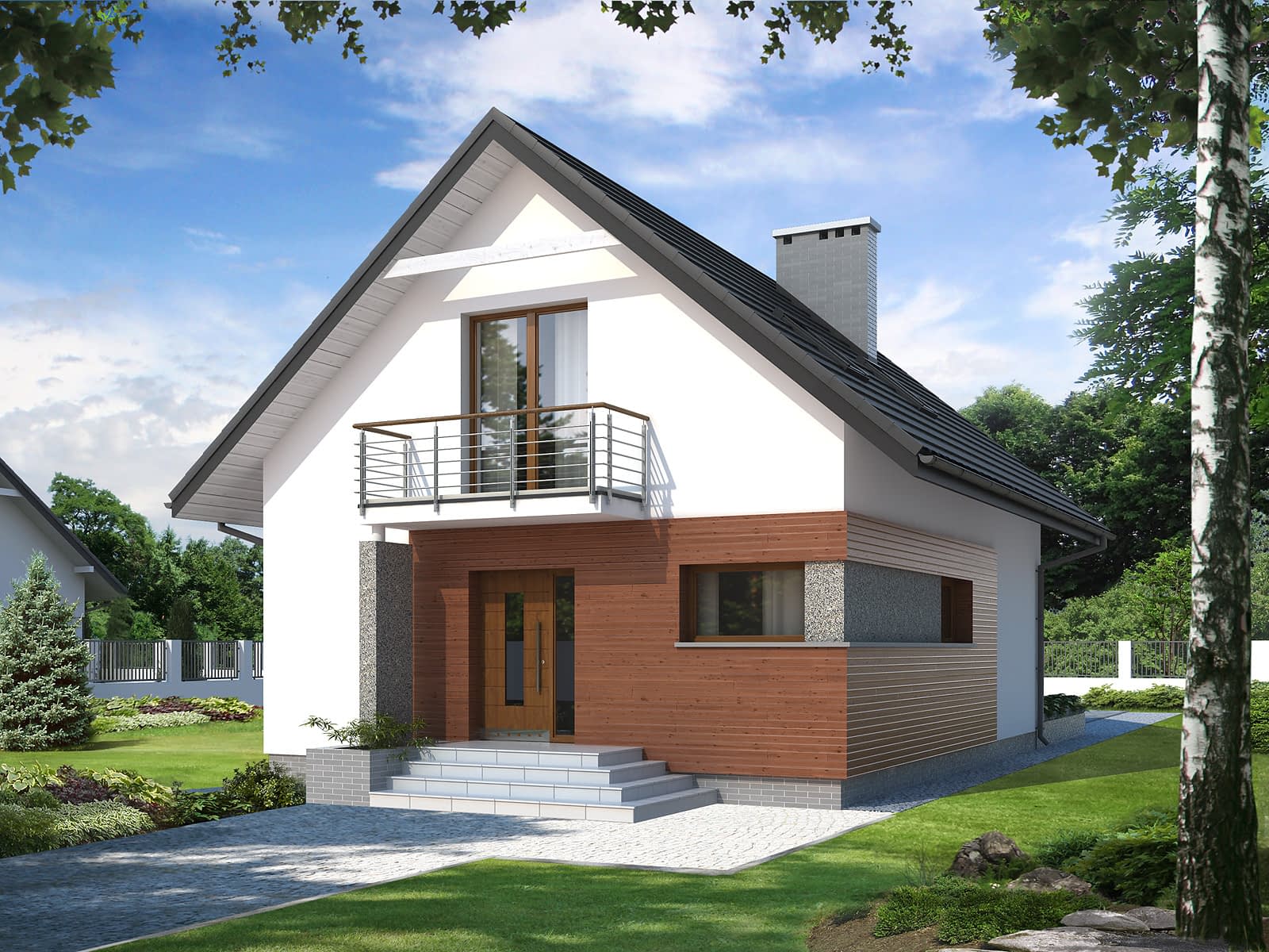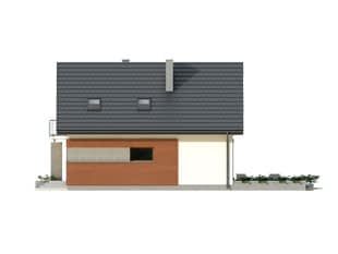 Niewielki dom jednorodzinny, parterowy z użytkowym poddaszem, przeznaczony dla 4-osobowej rodziny. Dom został ujęty w prostą, klasyczną bryłę, na rzucie prostokąta, przykrytą dwuspadowym dachem, wzbogaconą o nowoczesne elewacje. Na parterze przewidziano część dzienną: salon z jadalnią, kuchnię ze spiżarnią oraz część gospodarczą, w tym kotłownię na paliwo stałe. Na poddaszu zaprojektowano trzy sypialnie, w tym jedną z łazienką, oraz garderobę.Konstrukcja