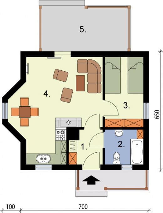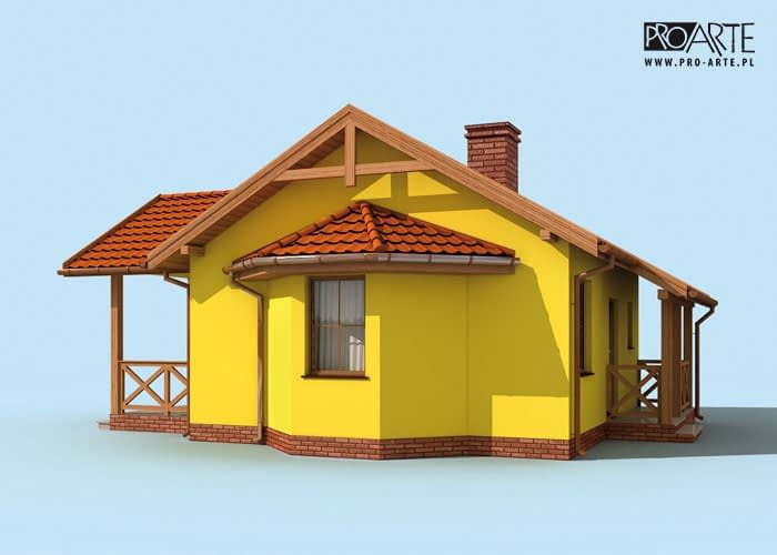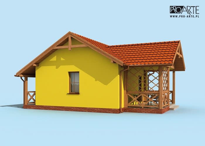 Jest to projekt, który może być ziszczeniem marzeń o zacisznym domku, w którym można spędzać leniwe, ciepłe, letnie dni. Idealny dla par w każdym wieku, będzie przestrzenią, która sprzyja miłości. Zadaszony ganek zaprasza do środka, po wejściu do niewielkiego wiatrołapu, po prawej znajduje się łazienka z oknem, którą można wyposażyć w prysznic, a nawet wannę. Dalej znajduje się największe pomieszczenie, salon, połączony z aneksem kuchennym. Z obszernego salonu, dobrze doświetlonego trzema oknami, można wyjść na imponujący zabudowany taras, tworzący uroczą werandę. Będzie on z pewnością miejscem niejednej romantycznej kolacji oraz urokliwego śniadania.
