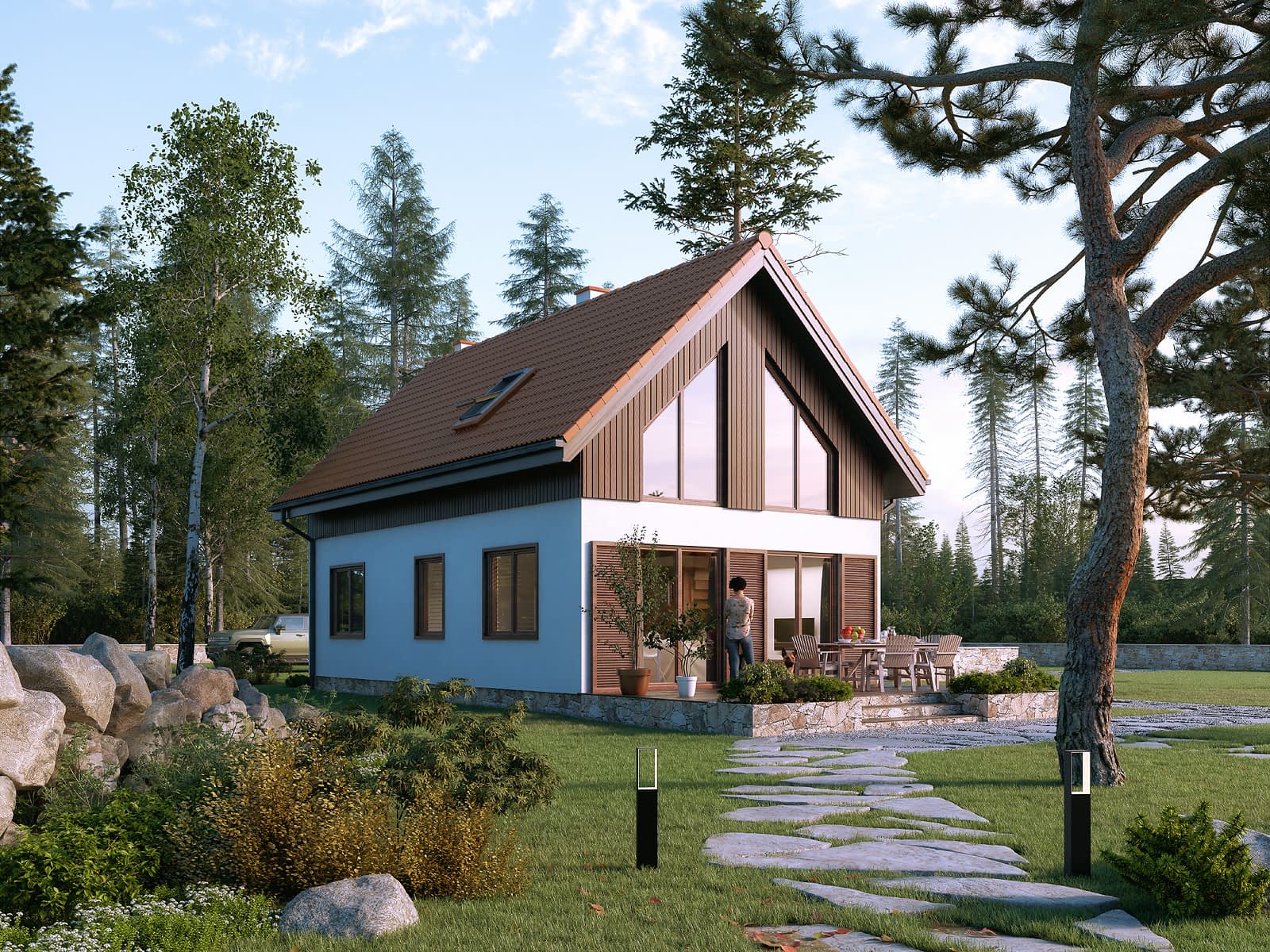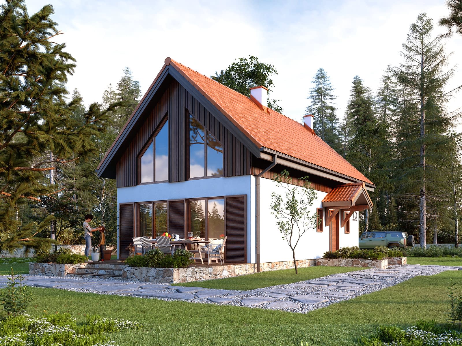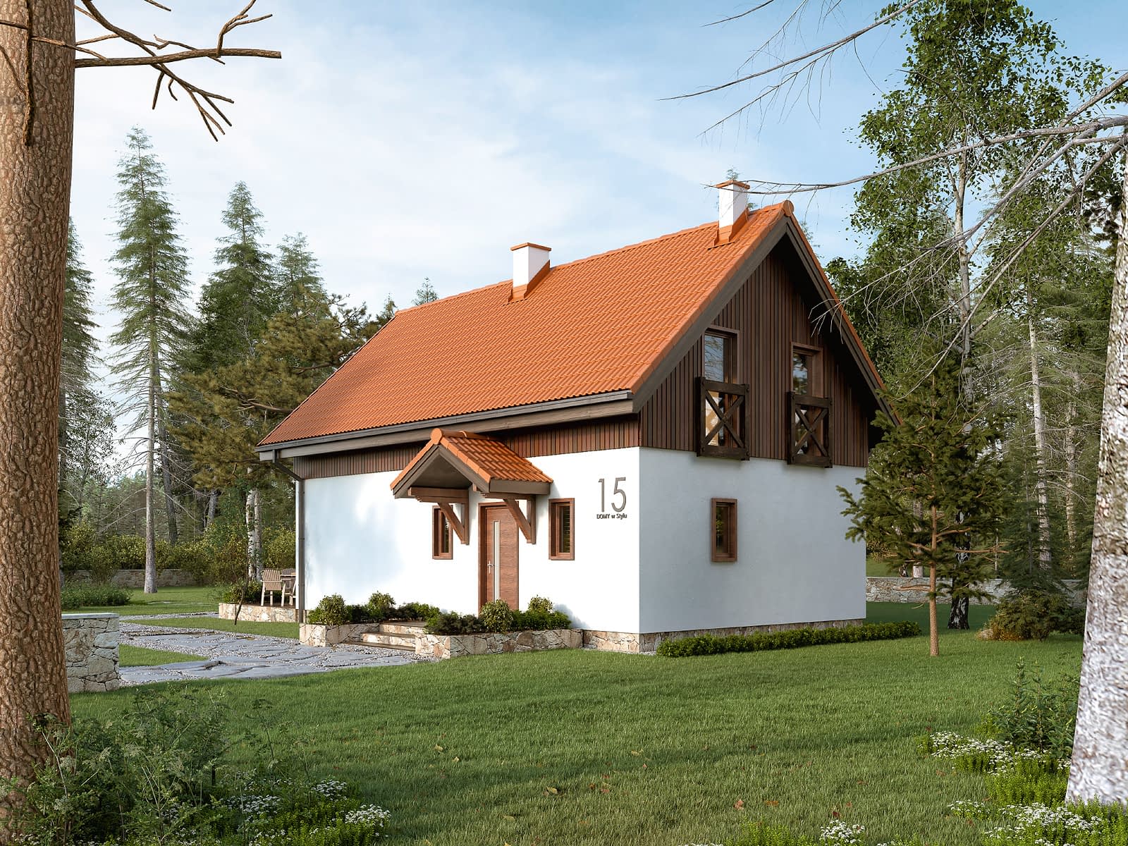 Listek dr-T to projekt domu z użytkowym poddaszem zaprojektowany w technologii szkieletu drewnianego. Projekt utrzymano w tradycyjnym stylu. Na elewacji pojawił się biały tynk i drewniana szalówka, a na dachu dachówka w ceglastym kolorze. Parter to otwarta część dzienna. Pojawił się tu salon, jadalnia i otwarta kuchnia. Program funkcjonalny parteru dopełnia dodatkowy pokój, który stanowi sypialnię rodziców. Na parterze zaprojektowano dwie wygodne sypialnie oraz rodzinną łazienkę. W projekcie pojawiła się antresola, która z całą pewnością stanowi ciekawy element domu.Konstrukcja