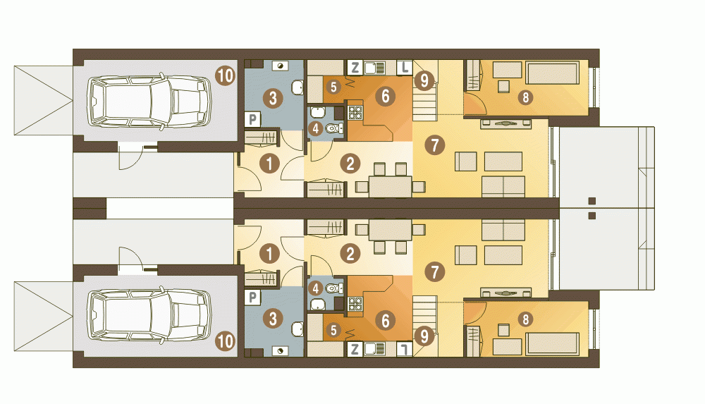 (Uwaga: projekty typu bliźniak oferujemy jako domy dwulokalowe, projekt można zamówić również w zabudowie bliźniaczej)Jeden segment to bardzo wąski piętrowy dom dla 4 lub 5-cio osobowej rodziny zaprojektowany z myślą o wąskich i nietypowych działka oraz do zabudowy bliźniaczej i szeregowej. Na parterze w strefie wejściowej znajduje się wiatrołap, hol, wc, pomieszczenie z piecem CO.W strefie dziennej zaprojektowano otwartą kuchnię ze spiżarnią, otwarty salon oraz schody. Long posiada na parterze mały gabinet (pokój gościnny), który może zostać zlikwidowany i tym samym powiększyć salon. Części mieszkalnej nie połączono bezposrednio z garażem - wyjście z garażu zaprojektowano w zadaszonej strefie wejściowej. Na pietrze znajduje się przestronna łazienka oraz trzy sypialnie, rozmieszczone wokół dużego wygodnego holu z szafami.