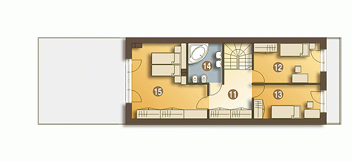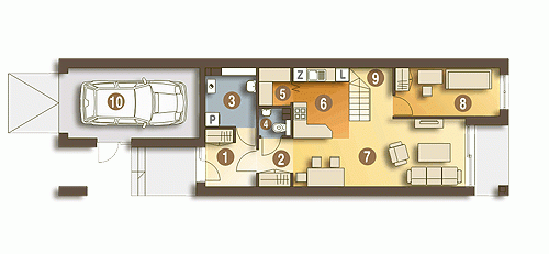 Long to bardzo wąski piętrowy dom dla 4 lub 5-cio osobowej rodziny zaprojektowany z myślą o wąskich i nietypowych działkach oraz do zabudowy bliźniaczej i szeregowej. Na parterze w strefie wejściowej znajduje się wiatrołap, hol, wc, pomieszczenie z piecem CO.W strefie dziennej zaprojektowano otwartą kuchnie ze spiżarnią, otwarty salon oraz schody. Long posiada na parterze mały gabinet (pokój gościnny), który może zostać zlikwidowany i tym samym powiększyć salon. Część mieszkalna nie połączono bezpośrednio z garażem - wyjście z garażu znajduje się w zadaszonej strefie wejściowej. Na piętrze zaprojektowano dużą łazienkę oraz trzy sypialnie, rozmieszczone wokół dużego wygodnego holu z szafami.